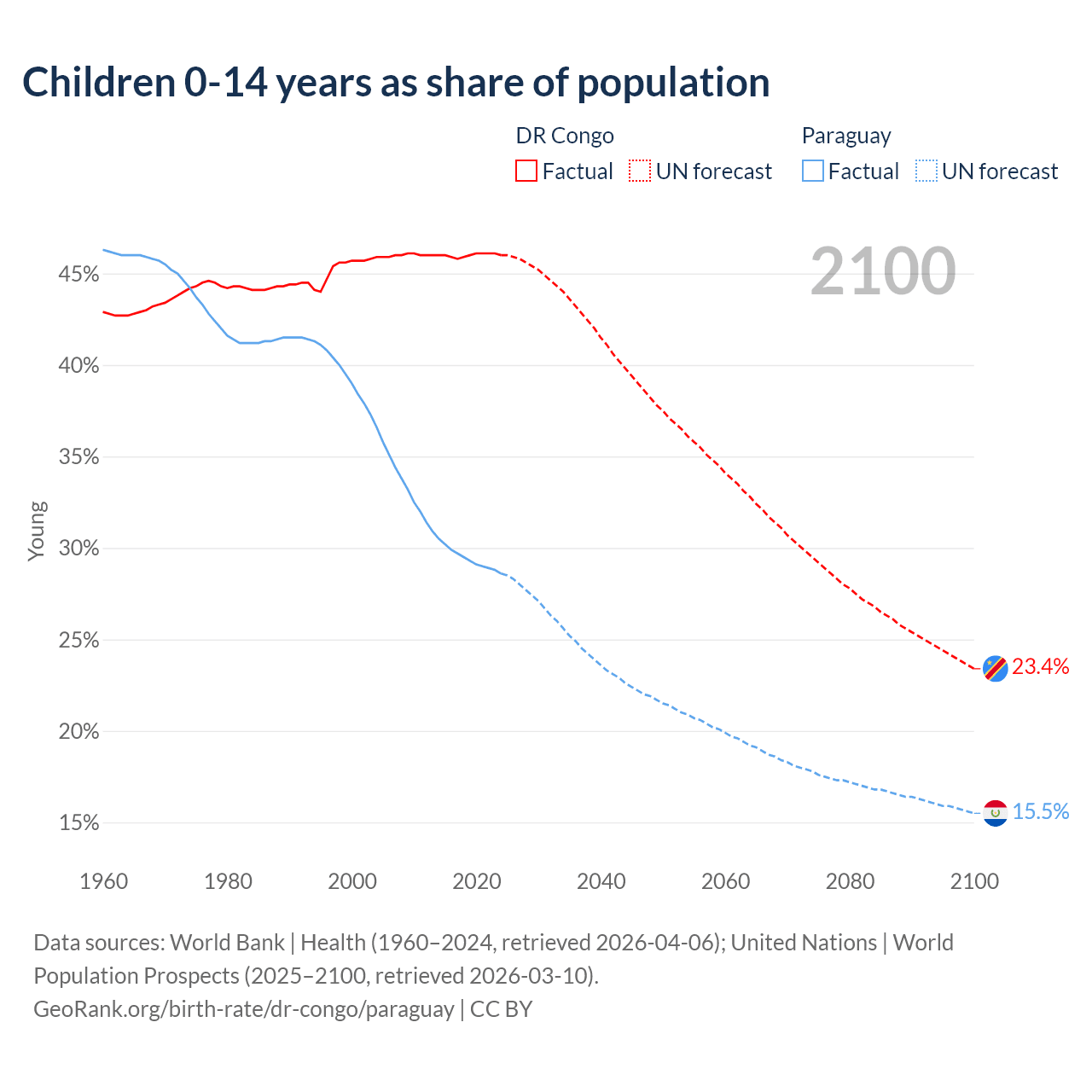 According to the latest available data on birth rates, the fertility rate in the DR Congo was 6.05 children per woman in 2023, compared to 2.42 in Paraguay in 2023. The replacement level is considered to be 2.1 children per woman.