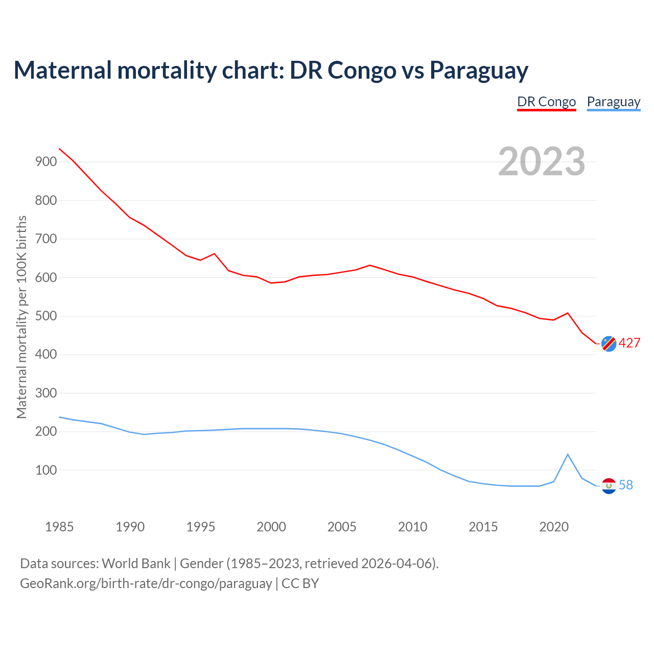 The maternal mortality rate, which is the probability of dying during childbirth or within 42 days of pregnancy termination, is 427 deaths per 100,000 live births in the DR Congo, compared to 58 deaths in Paraguay.