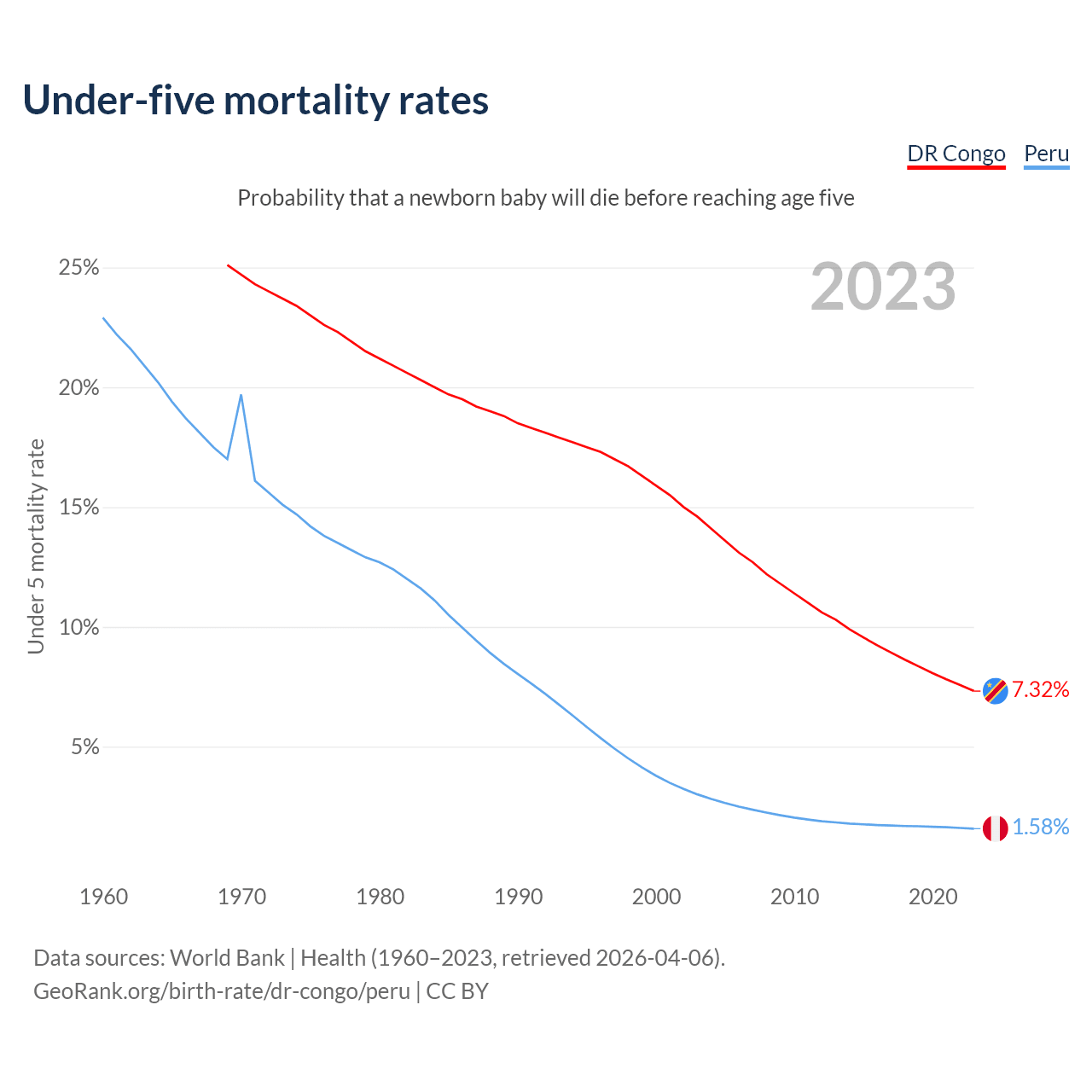 The chance that a newborn baby will die before reaching age five is 7.32% in the DR Congo and 1.58% in Peru. Above is a chart with historical data on under-five mortality rates.