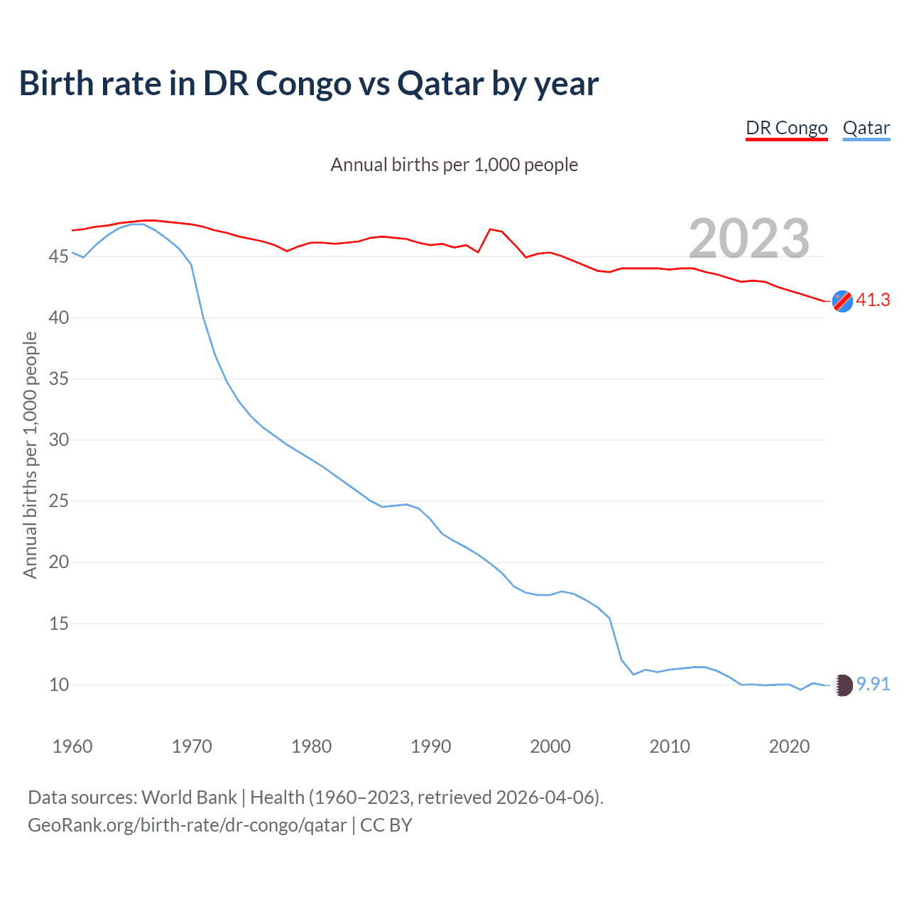The DR Congo has an annual birth rate of 41.3 births per 1,000 people, compared to 9.91 for Qatar. The average number of children a woman is expected to have during her lifetime — the fertility rate, is 6.05 in the DR Congo and 1.73 in Qatar — 71.4% difference.