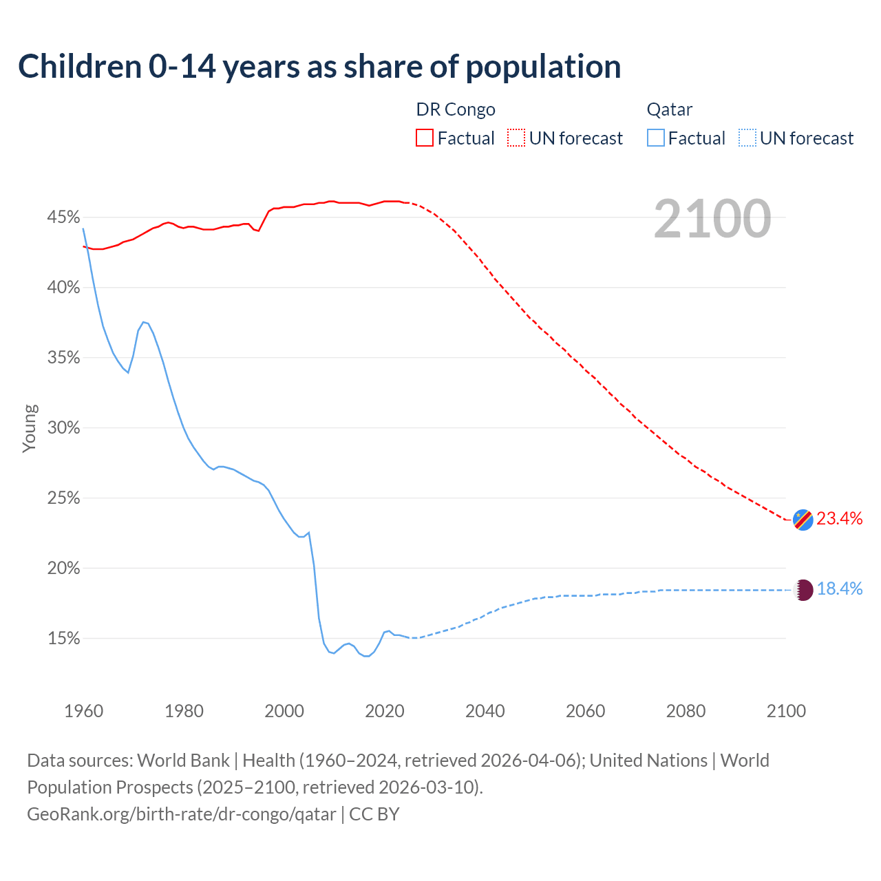 According to the latest available data on birth rates, the fertility rate in the DR Congo was 6.05 children per woman in 2023, compared to 1.73 in Qatar in 2023. The replacement level is considered to be 2.1 children per woman.