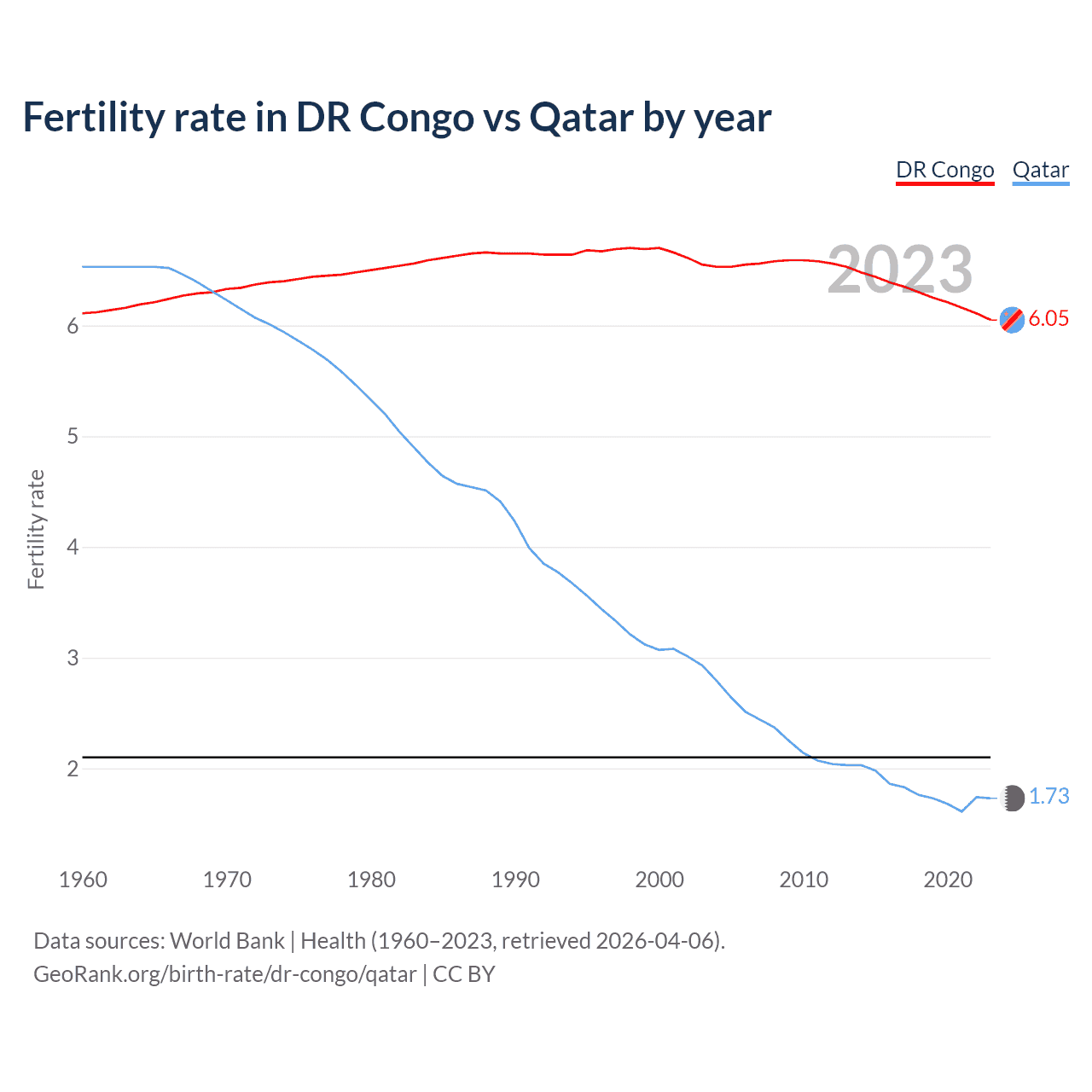 1960 vs 2023, the fertility rate has decreased by 0.88% in the DR Congo and by 73.5% in Qatar — in 1960, it was 6.11 and 6.53, respectively.