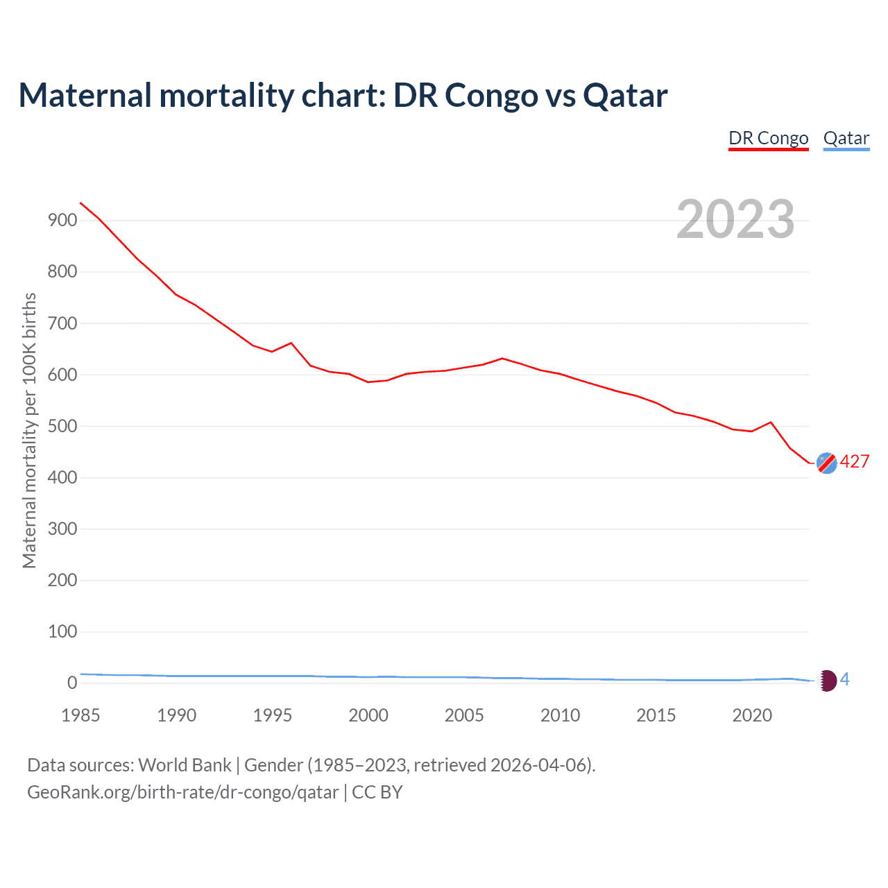 The maternal mortality rate, which is the probability of dying during childbirth or within 42 days of pregnancy termination, is 427 deaths per 100,000 live births in the DR Congo, compared to 4 deaths in Qatar.