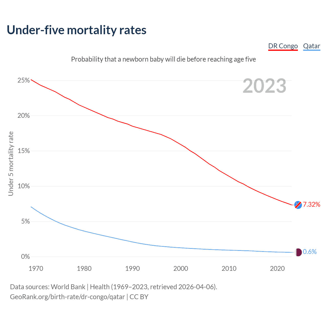 The chance that a newborn baby will die before reaching age five is 7.32% in the DR Congo and 0.6% in Qatar. Above is a chart with historical data on under-five mortality rates.