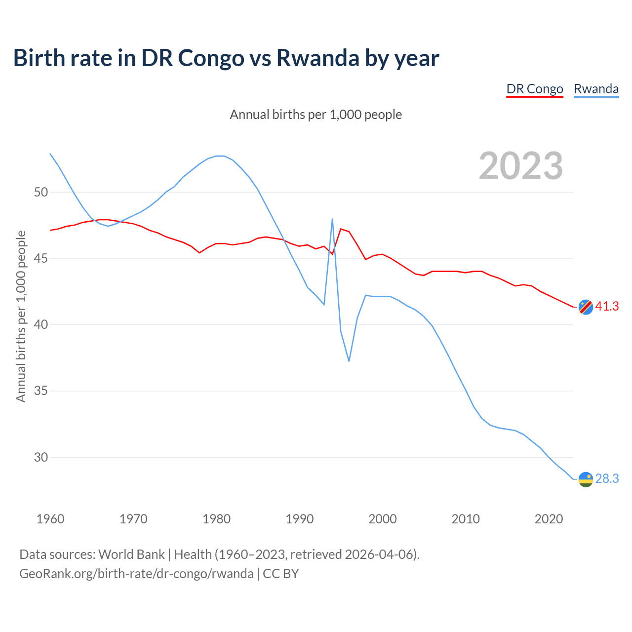 The DR Congo has an annual birth rate of 41.3 births per 1,000 people, compared to 28.3 for Rwanda. The average number of children a woman is expected to have during her lifetime — the fertility rate, is 6.05 in the DR Congo and 3.7 in Rwanda — 38.9% difference.