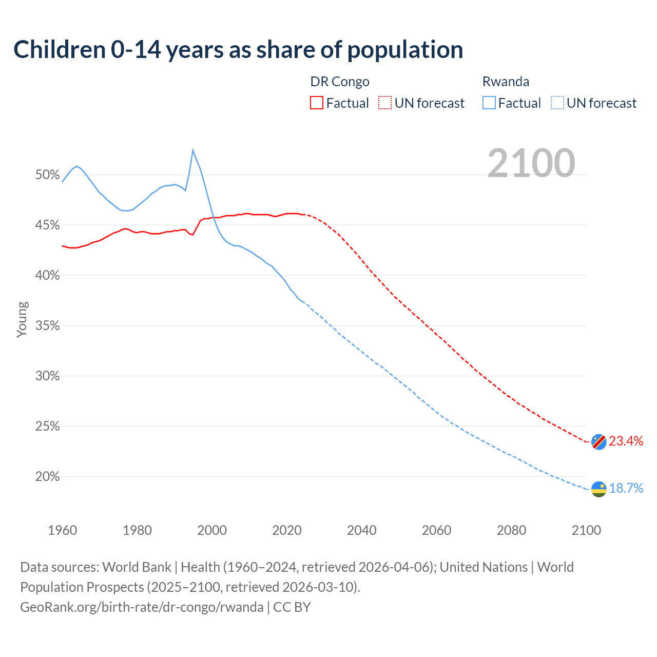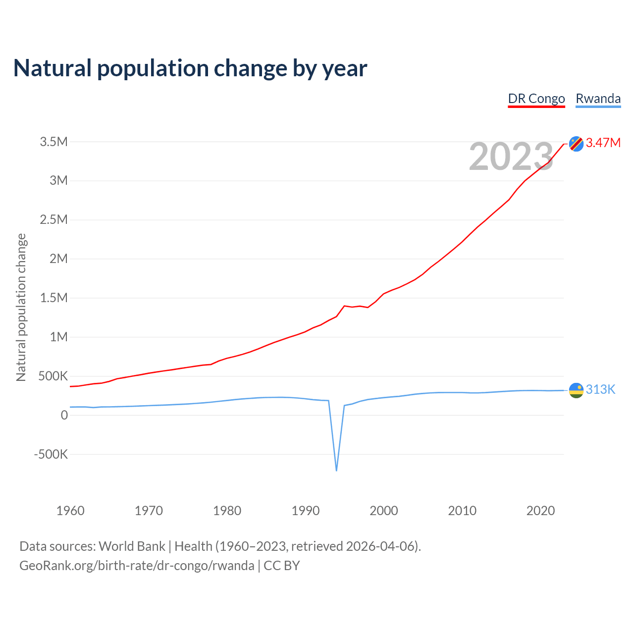 According to the latest available data on birth rates, the fertility rate in the DR Congo was 6.05 children per woman in 2023, compared to 3.7 in Rwanda in 2023. The replacement level is considered to be 2.1 children per woman.