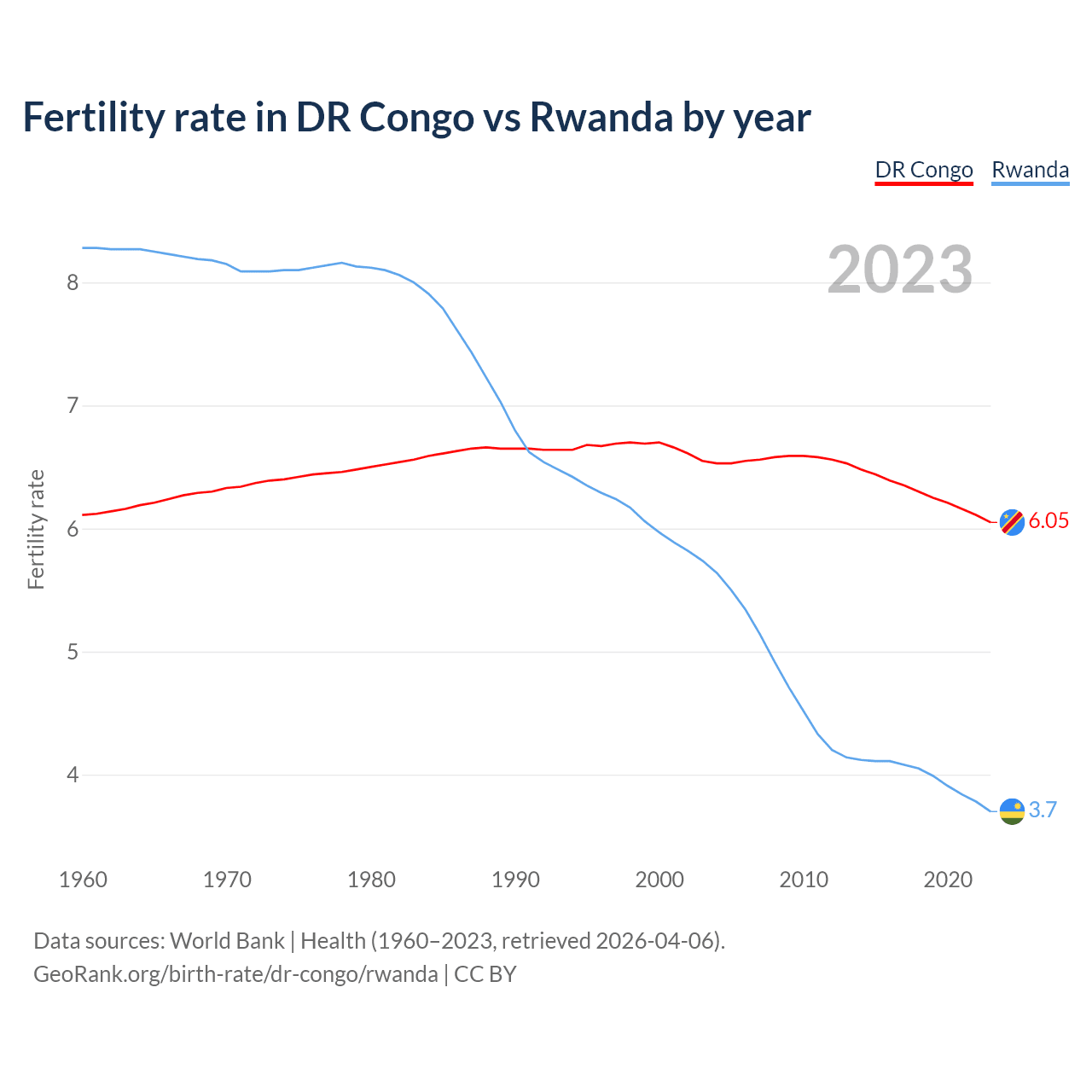 1960 vs 2023, the fertility rate has decreased by 0.88% in the DR Congo and by 55.4% in Rwanda — in 1960, it was 6.11 and 8.28, respectively.