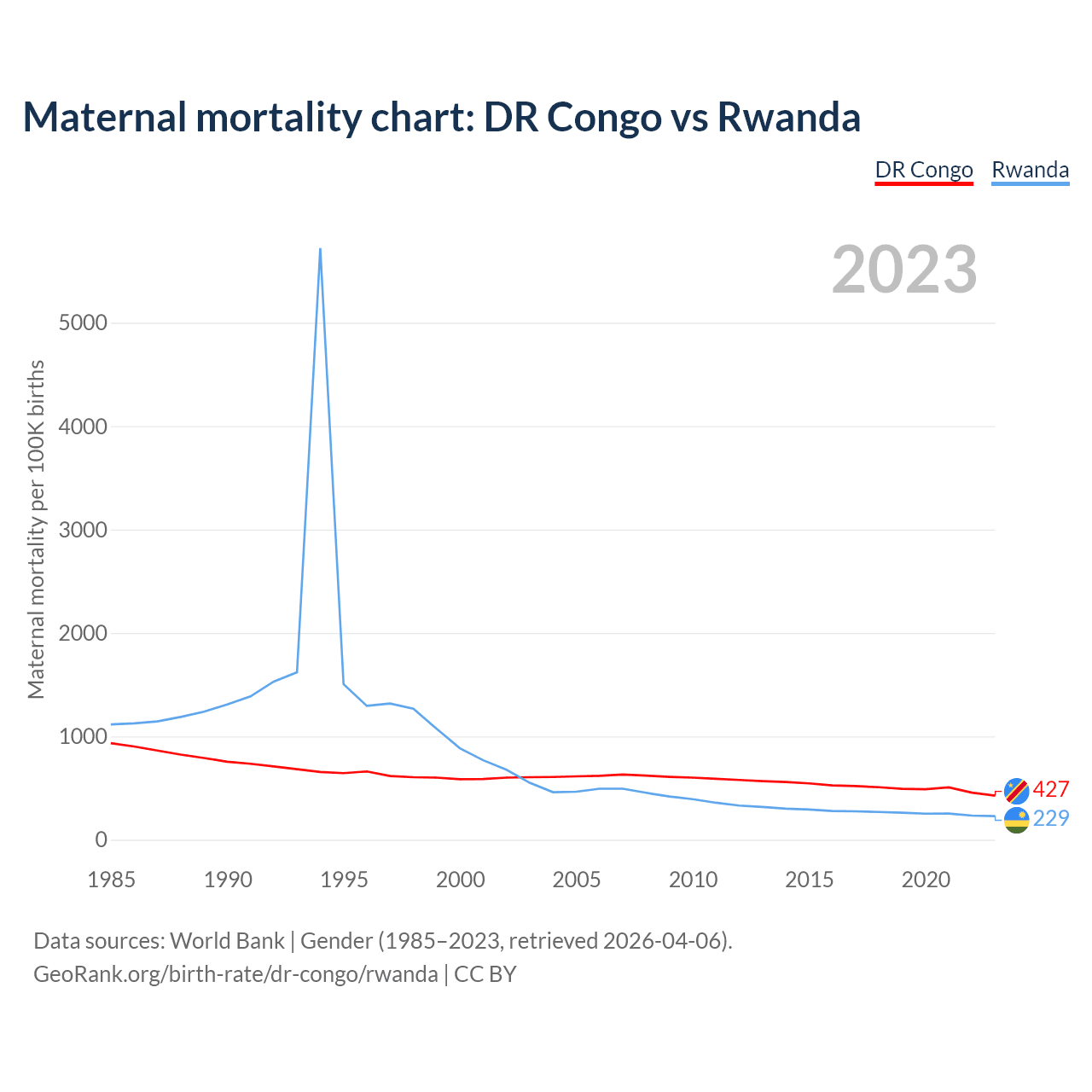 The maternal mortality rate, which is the probability of dying during childbirth or within 42 days of pregnancy termination, is 427 deaths per 100,000 live births in the DR Congo, compared to 229 deaths in Rwanda.