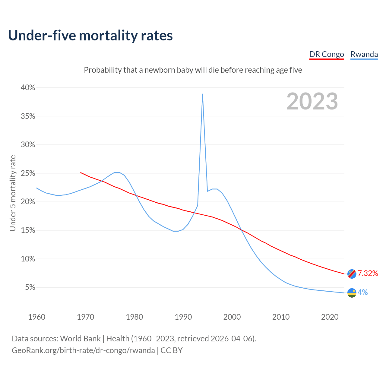 The chance that a newborn baby will die before reaching age five is 7.32% in the DR Congo and 4% in Rwanda. Above is a chart with historical data on under-five mortality rates.
