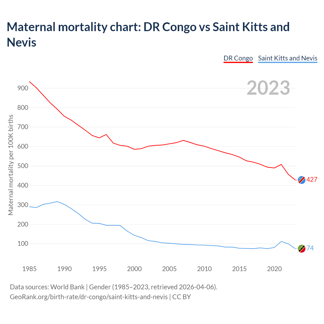 The maternal mortality rate, which is the probability of dying during childbirth or within 42 days of pregnancy termination, is 427 deaths per 100,000 live births in the DR Congo, compared to 74 deaths in Saint Kitts and Nevis.