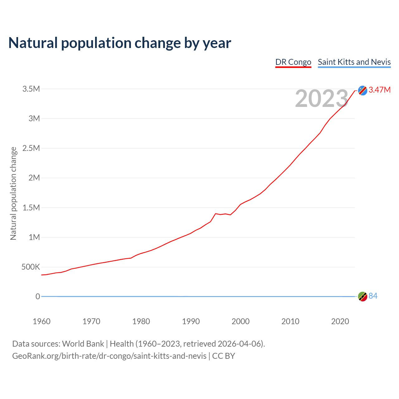 Check the DR Congo vs Saint Kitts and Nevis population clock for a dynamic visualization of the changing population.