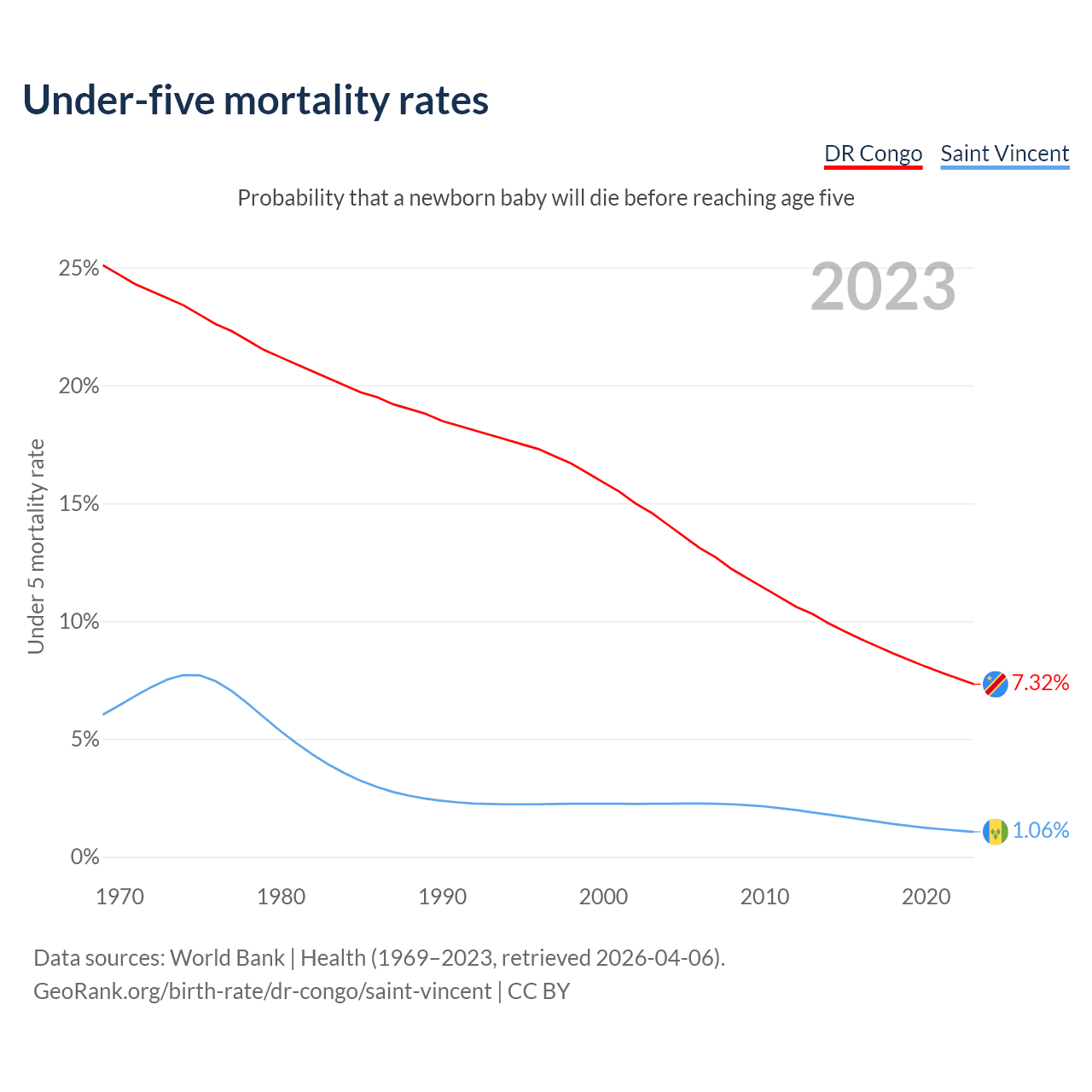 The chance that a newborn baby will die before reaching age five is 7.32% in the DR Congo and 1.06% in Saint Vincent. Above is a chart with historical data on under-five mortality rates.