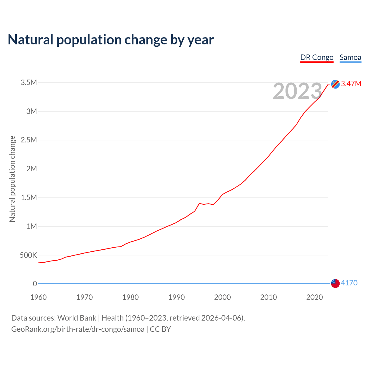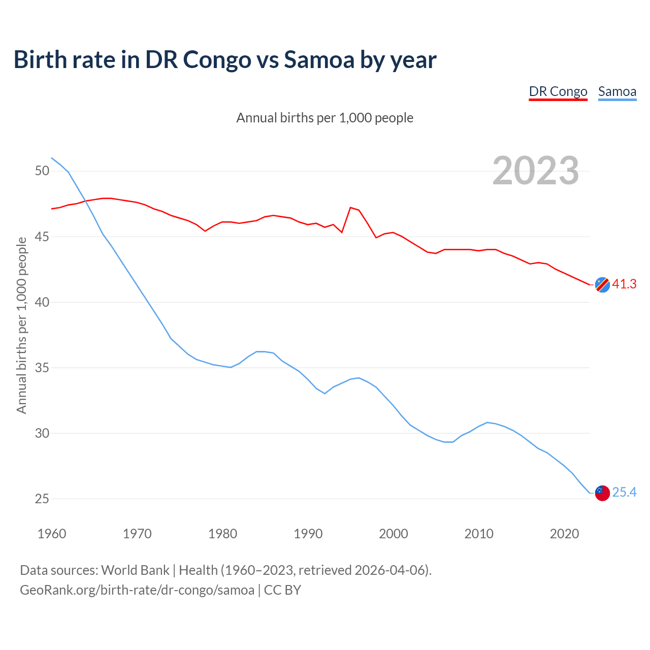 The DR Congo has an annual birth rate of 41.3 births per 1,000 people, compared to 25.4 for Samoa. The average number of children a woman is expected to have during her lifetime — the fertility rate, is 6.05 in the DR Congo and 3.83 in Samoa — 36.7% difference.