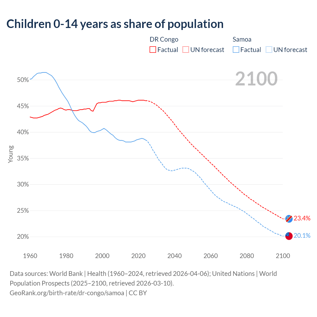 According to the latest available data on birth rates, the fertility rate in the DR Congo was 6.05 children per woman in 2023, compared to 3.83 in Samoa in 2023. The replacement level is considered to be 2.1 children per woman.