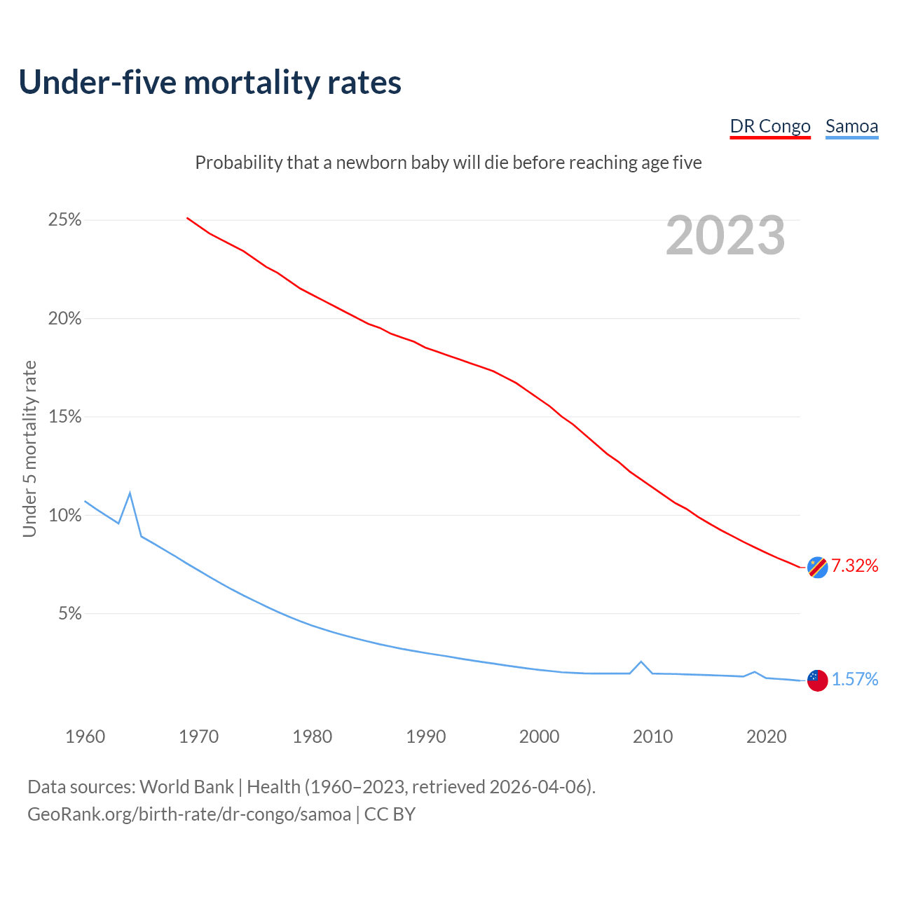 The chance that a newborn baby will die before reaching age five is 7.32% in the DR Congo and 1.57% in Samoa. Above is a chart with historical data on under-five mortality rates.