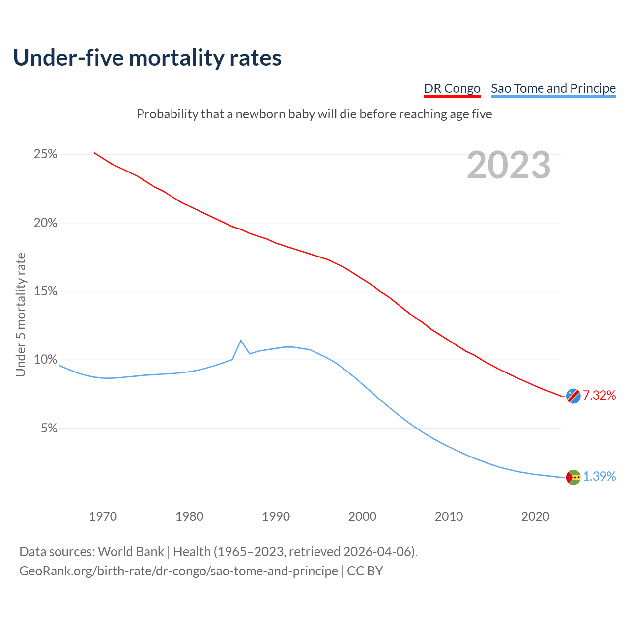 The chance that a newborn baby will die before reaching age five is 7.32% in the DR Congo and 1.39% in Sao Tome and Principe. Above is a chart with historical data on under-five mortality rates.