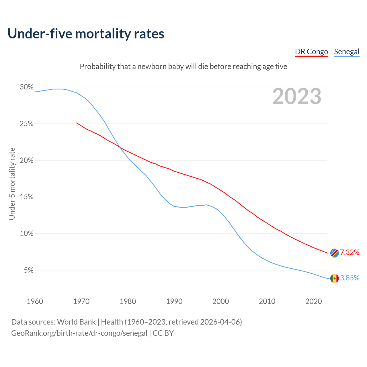 The chance that a newborn baby will die before reaching age five is 7.32% in the DR Congo and 3.85% in Senegal. Above is a chart with historical data on under-five mortality rates.