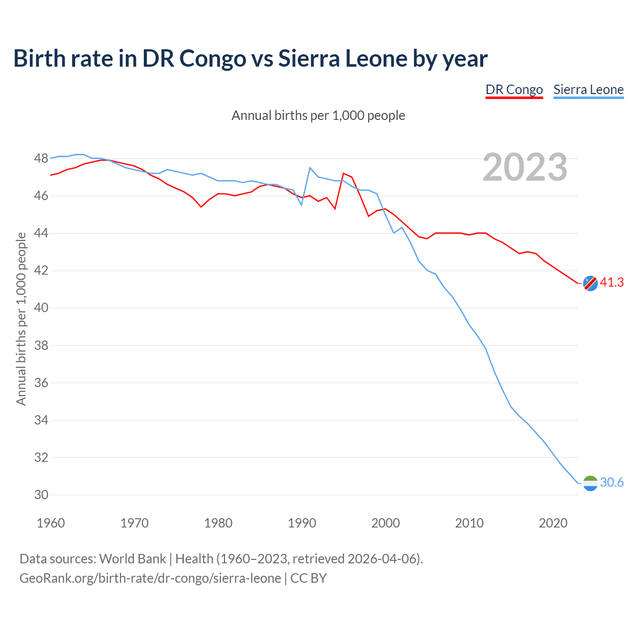 The DR Congo has an annual birth rate of 41.3 births per 1,000 people, compared to 30.6 for Sierra Leone. The average number of children a woman is expected to have during her lifetime — the fertility rate, is 6.05 in the DR Congo and 3.79 in Sierra Leone — 37.3% difference.