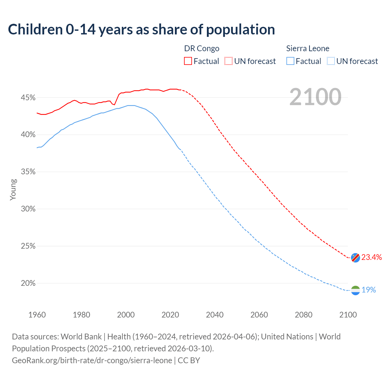 According to the latest available data on birth rates, the fertility rate in the DR Congo was 6.05 children per woman in 2023, compared to 3.79 in Sierra Leone in 2023. The replacement level is considered to be 2.1 children per woman.