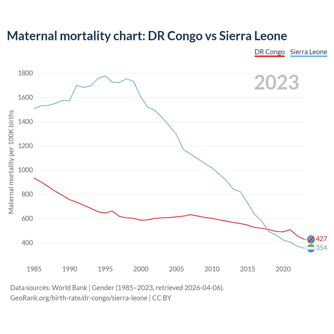 The maternal mortality rate, which is the probability of dying during childbirth or within 42 days of pregnancy termination, is 427 deaths per 100,000 live births in the DR Congo, compared to 354 deaths in Sierra Leone.