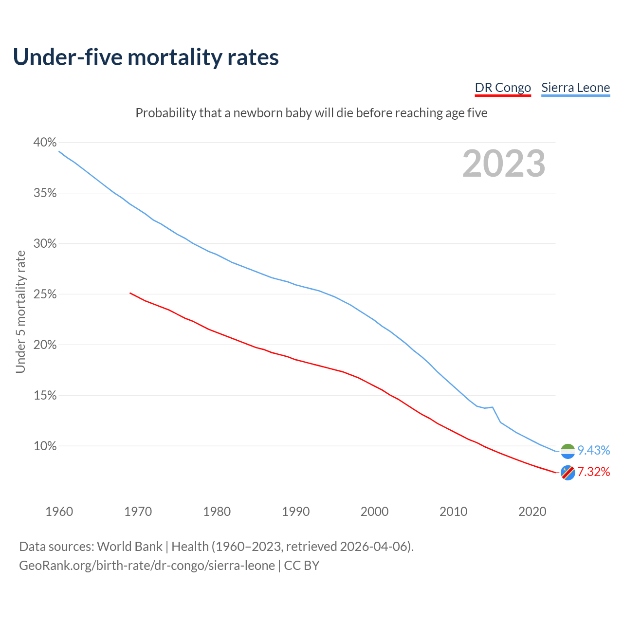 The chance that a newborn baby will die before reaching age five is 7.32% in the DR Congo and 9.43% in Sierra Leone. Above is a chart with historical data on under-five mortality rates.