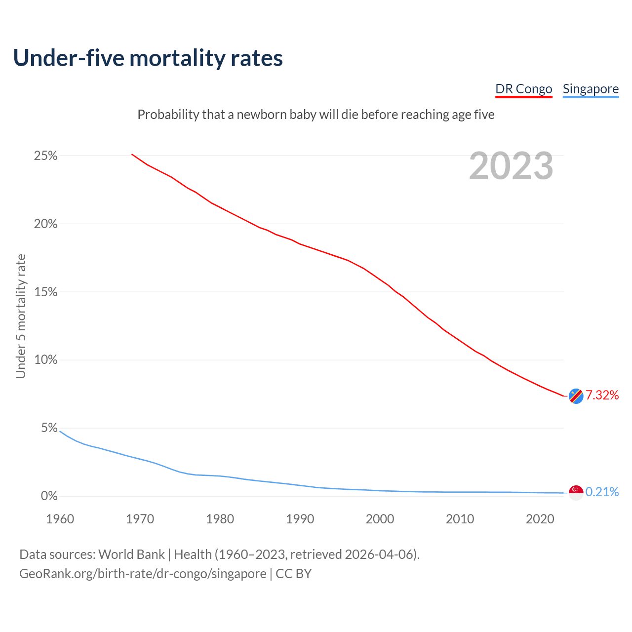 The chance that a newborn baby will die before reaching age five is 7.32% in the DR Congo and 0.21% in Singapore. Above is a chart with historical data on under-five mortality rates.