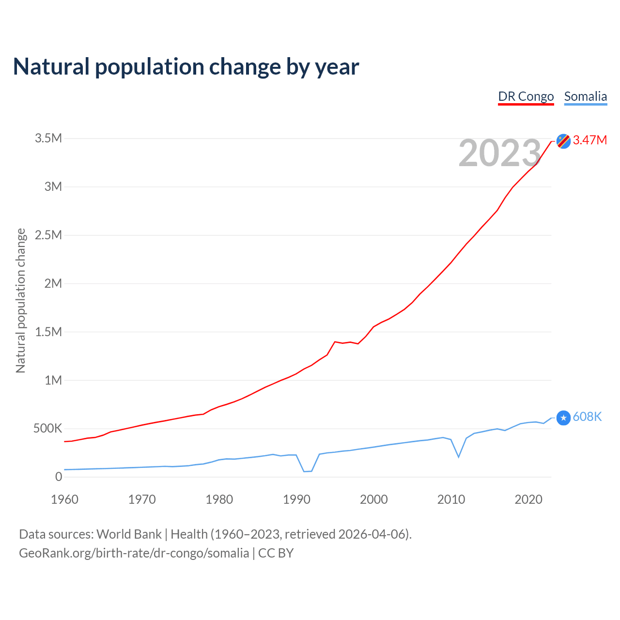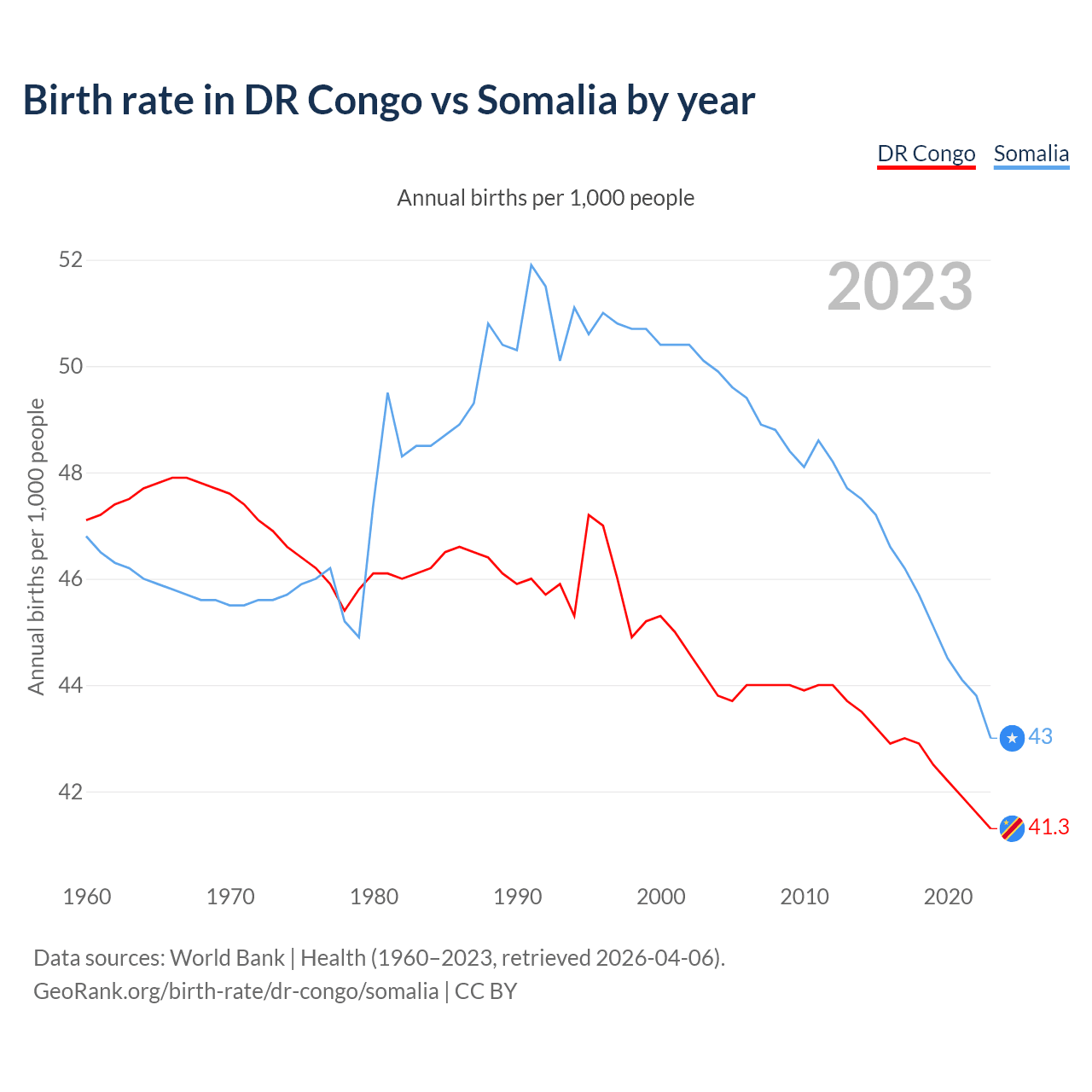 The DR Congo has an annual birth rate of 41.3 births per 1,000 people, compared to 43 for Somalia. The average number of children a woman is expected to have during her lifetime — the fertility rate, is 6.05 in the DR Congo and 6.13 in Somalia — 1.34% difference.
