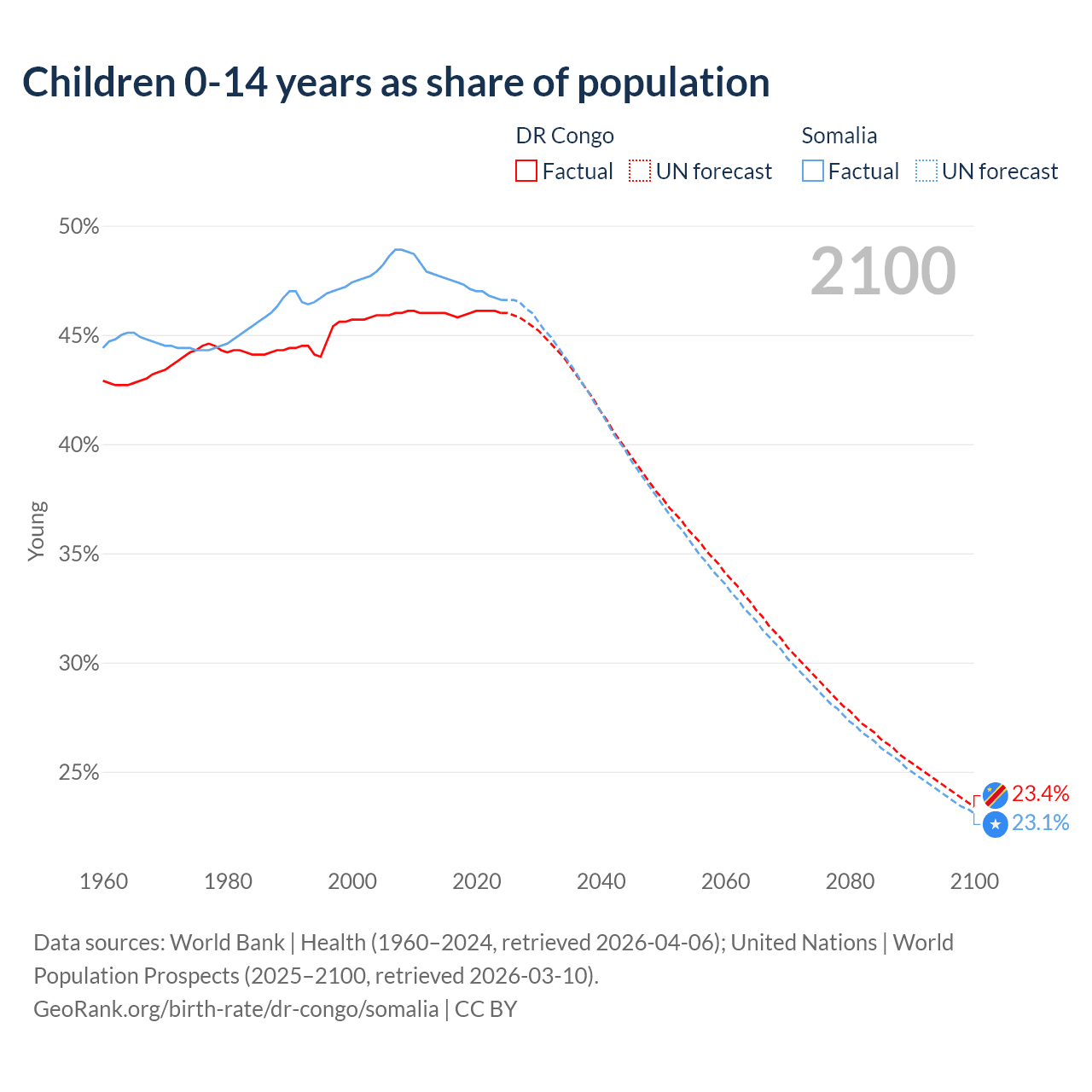 1960 vs 2023, the fertility rate has decreased by 0.88% in the DR Congo and by 15.4% in Somalia — in 1960, it was 6.11 and 7.25, respectively.