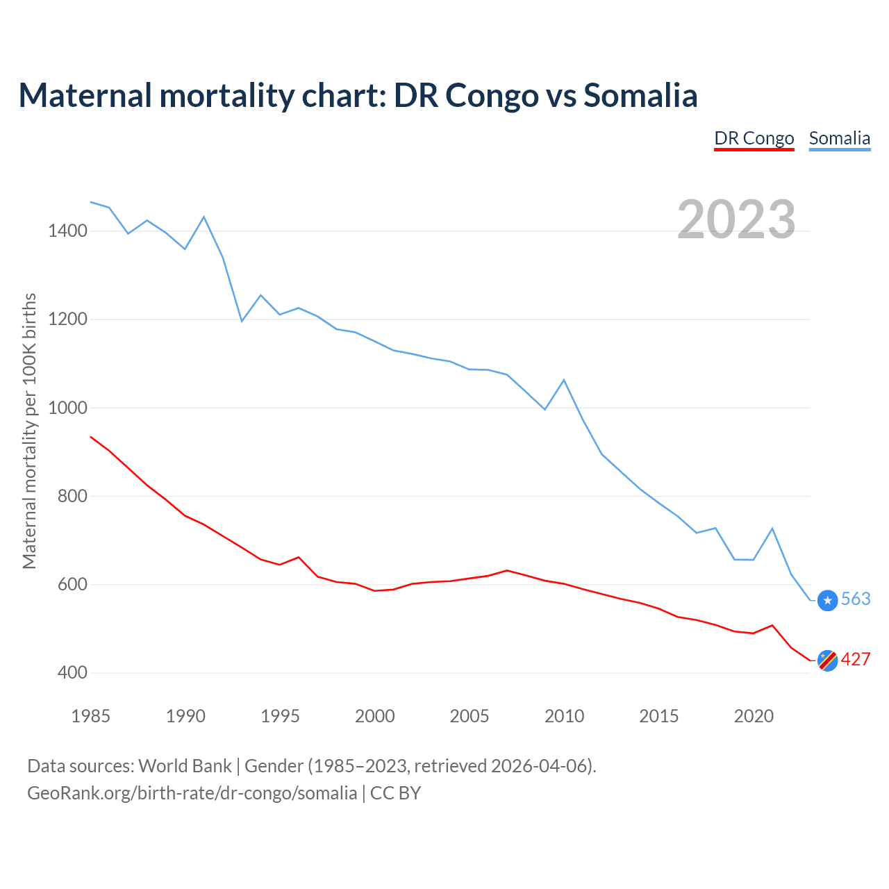 The maternal mortality rate, which is the probability of dying during childbirth or within 42 days of pregnancy termination, is 427 deaths per 100,000 live births in the DR Congo, compared to 563 deaths in Somalia.