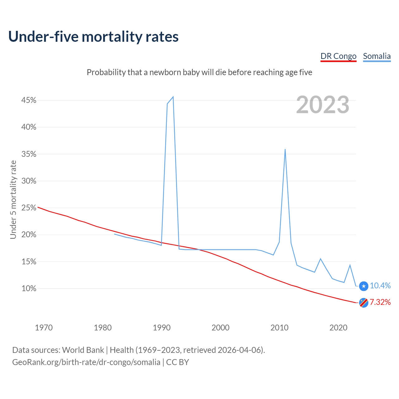 The chance that a newborn baby will die before reaching age five is 7.32% in the DR Congo and 10.4% in Somalia. Above is a chart with historical data on under-five mortality rates.
