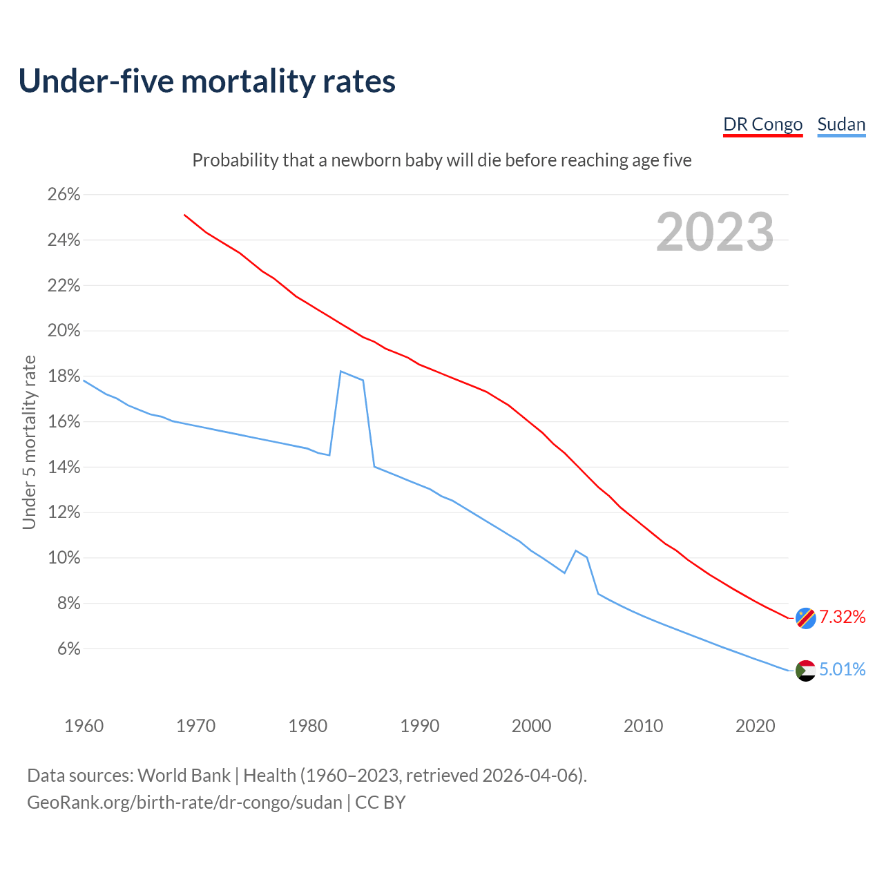 The chance that a newborn baby will die before reaching age five is 7.32% in the DR Congo and 5.01% in Sudan. Above is a chart with historical data on under-five mortality rates.