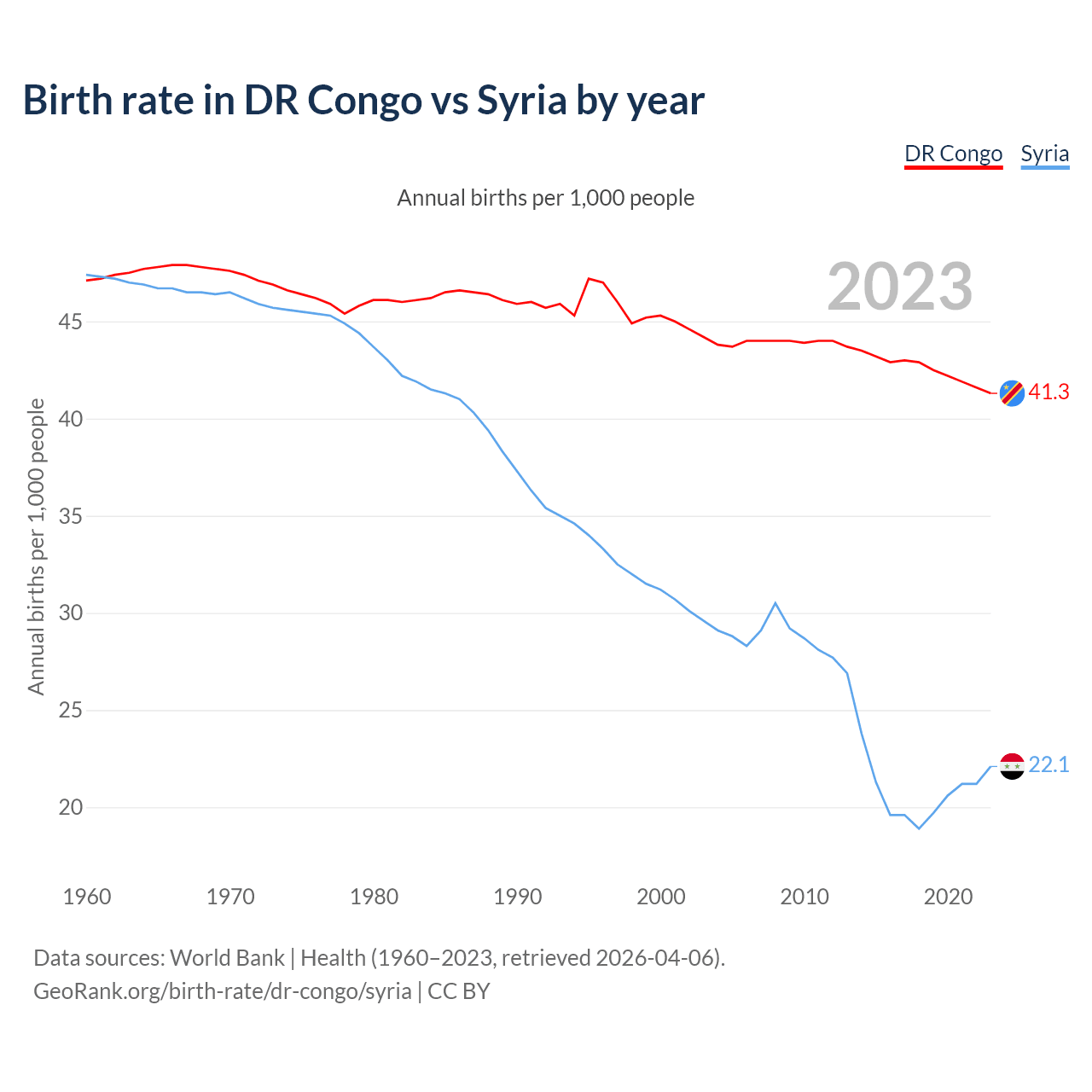 The DR Congo has an annual birth rate of 41.3 births per 1,000 people, compared to 22.1 for Syria. The average number of children a woman is expected to have during her lifetime — the fertility rate, is 6.05 in the DR Congo and 2.71 in Syria — 55.2% difference.
