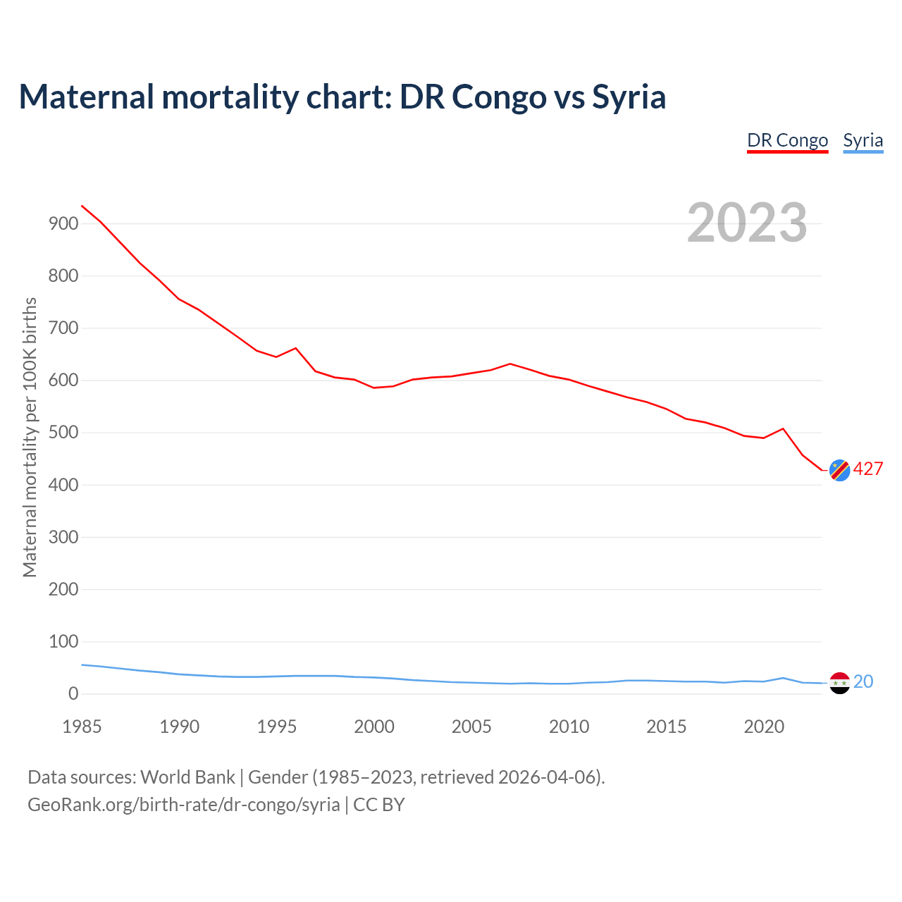 The maternal mortality rate, which is the probability of dying during childbirth or within 42 days of pregnancy termination, is 427 deaths per 100,000 live births in the DR Congo, compared to 20 deaths in Syria.