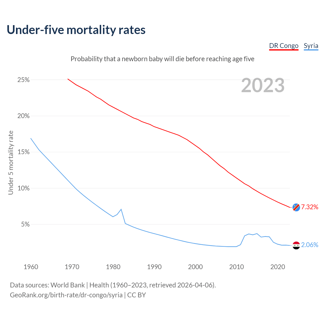 The chance that a newborn baby will die before reaching age five is 7.32% in the DR Congo and 2.06% in Syria. Above is a chart with historical data on under-five mortality rates.
