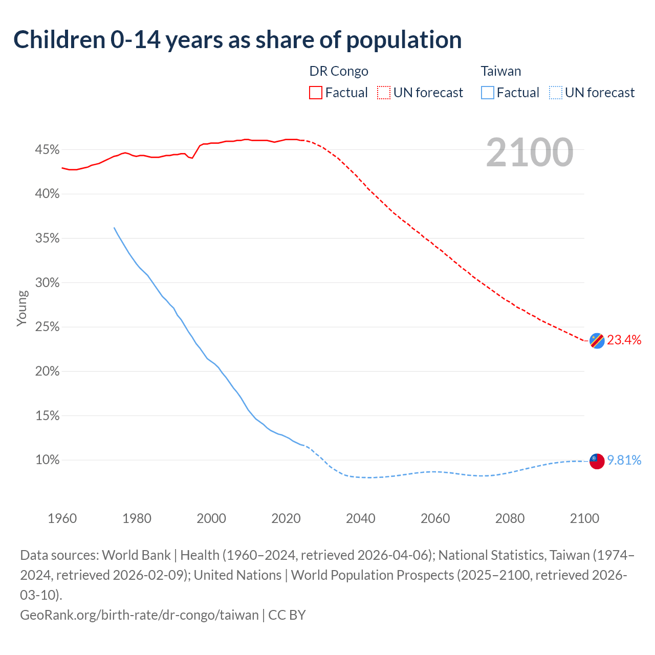 Data sources: World Bank | Health (1960–2024, retrieved 2026-04-06); National Statistics, Taiwan (1974–2024, retrieved 2026-02-09); United Nations | World Population Prospects (2025–2100, retrieved 2026-03-10).