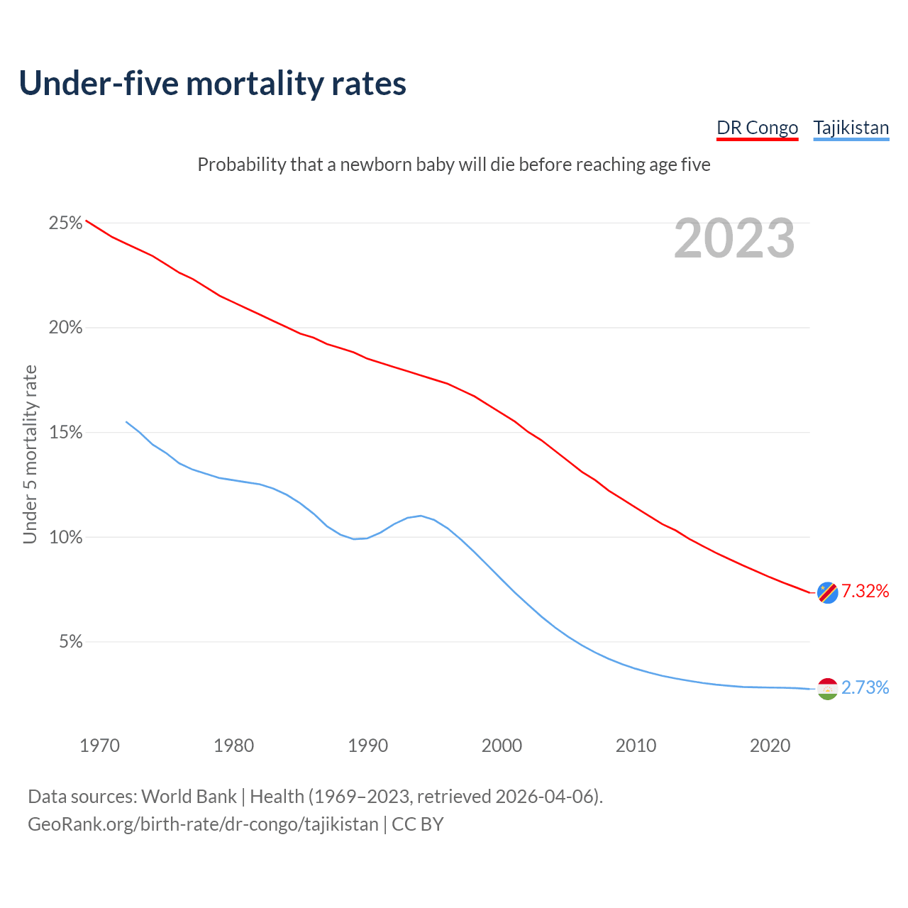 The chance that a newborn baby will die before reaching age five is 7.32% in the DR Congo and 2.73% in Tajikistan. Above is a chart with historical data on under-five mortality rates.