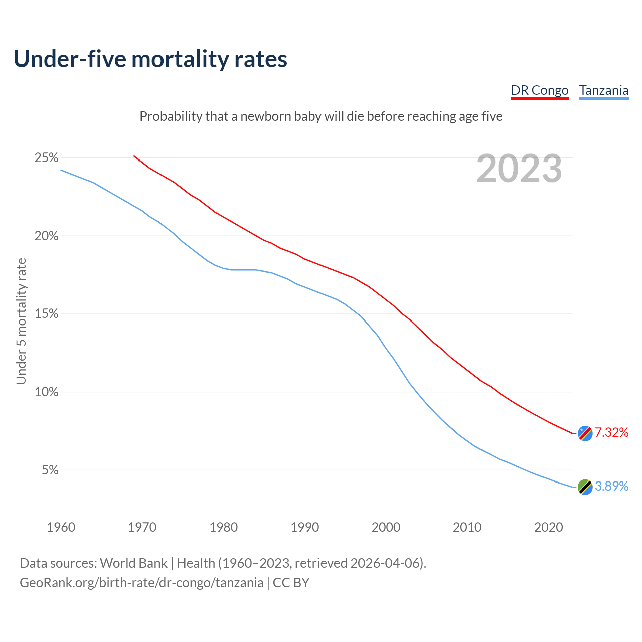 The chance that a newborn baby will die before reaching age five is 7.32% in the DR Congo and 3.89% in Tanzania. Above is a chart with historical data on under-five mortality rates.