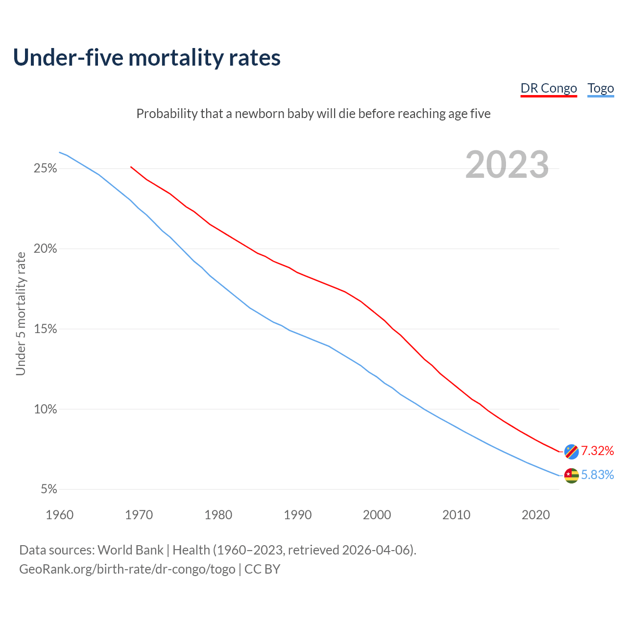 The chance that a newborn baby will die before reaching age five is 7.32% in the DR Congo and 5.83% in Togo. Above is a chart with historical data on under-five mortality rates.