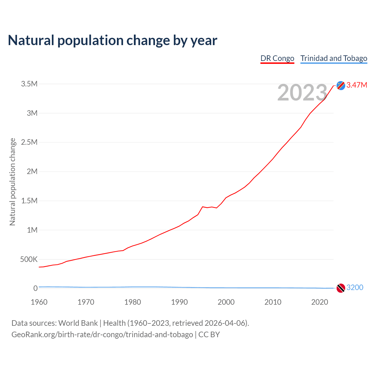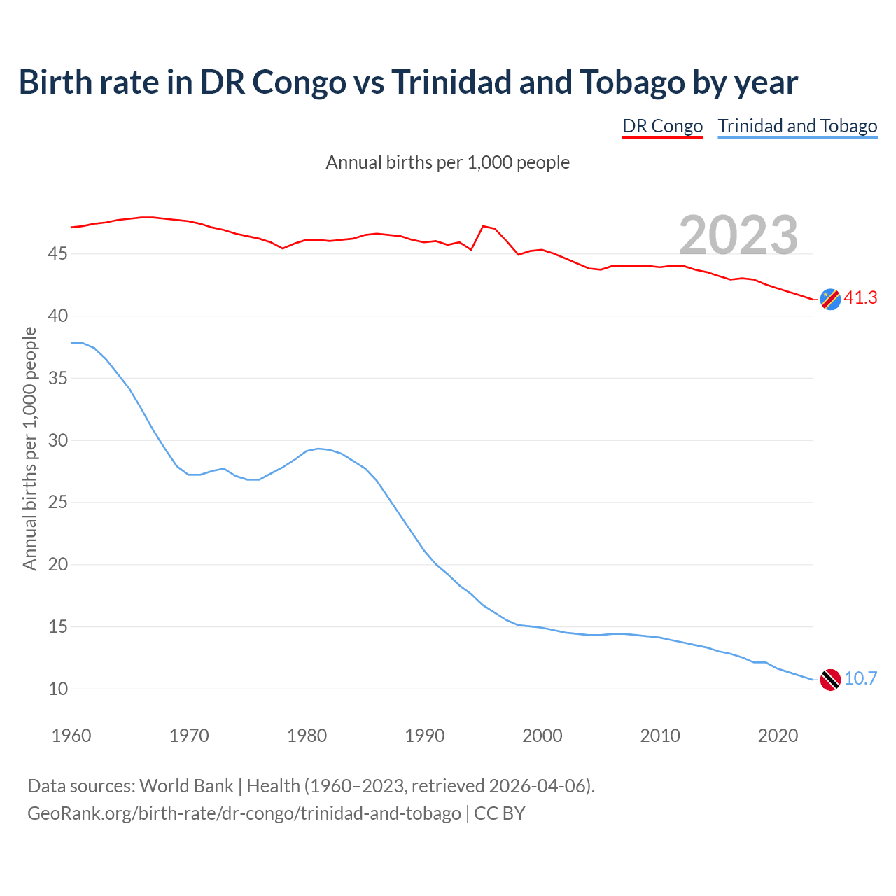 The DR Congo has an annual birth rate of 41.3 births per 1,000 people, compared to 10.7 for Trinidad and Tobago. The average number of children a woman is expected to have during her lifetime — the fertility rate, is 6.05 in the DR Congo and 1.53 in Trinidad and Tobago — 74.7% difference.