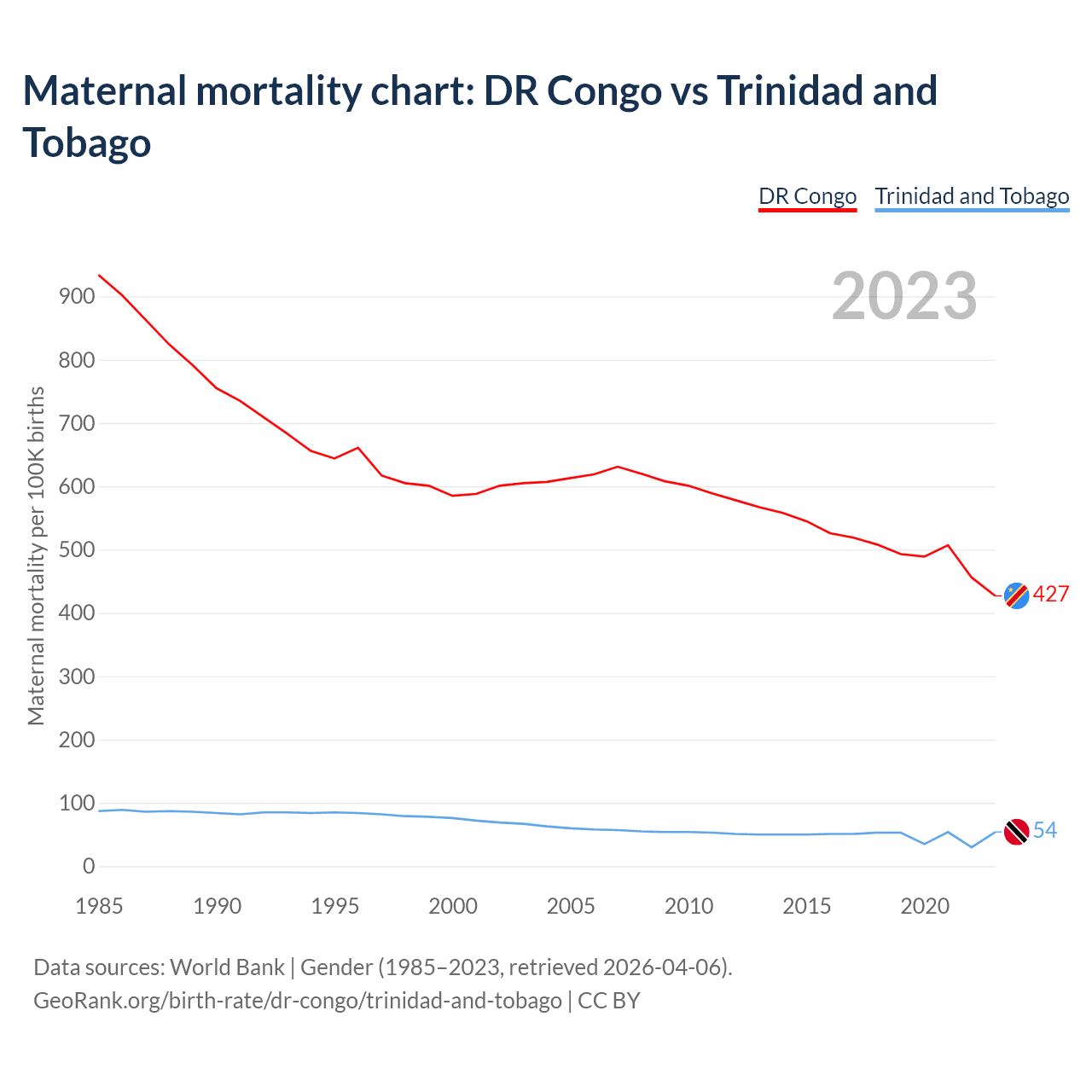 The maternal mortality rate, which is the probability of dying during childbirth or within 42 days of pregnancy termination, is 427 deaths per 100,000 live births in the DR Congo, compared to 54 deaths in Trinidad and Tobago.