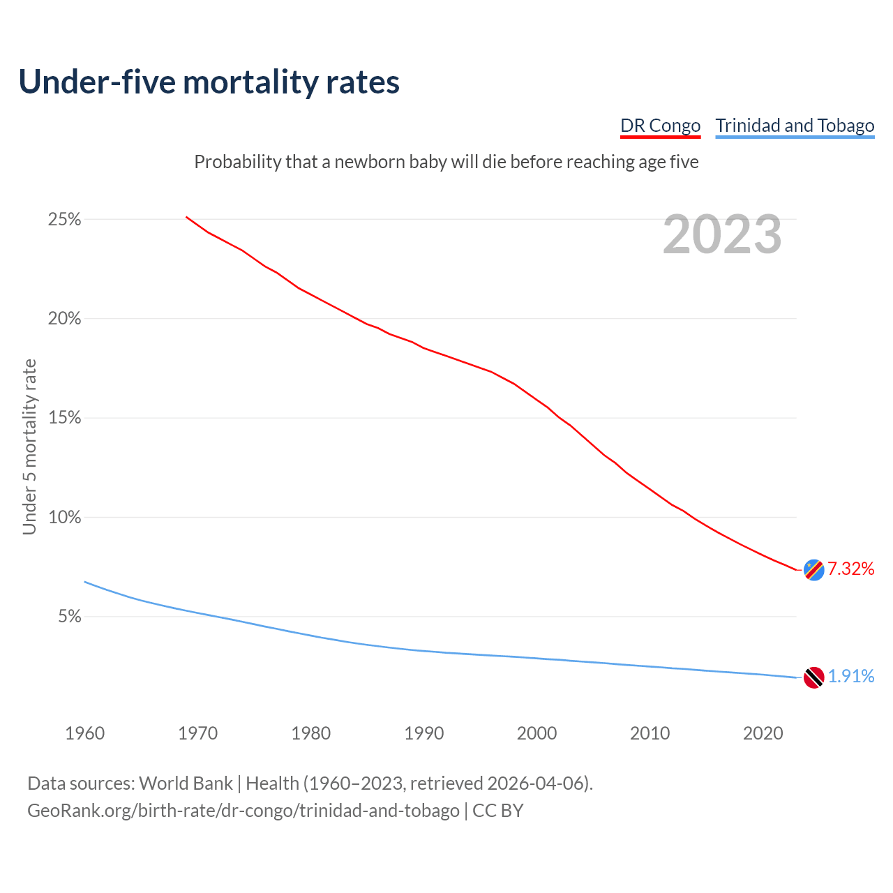 The chance that a newborn baby will die before reaching age five is 7.32% in the DR Congo and 1.91% in Trinidad and Tobago. Above is a chart with historical data on under-five mortality rates.
