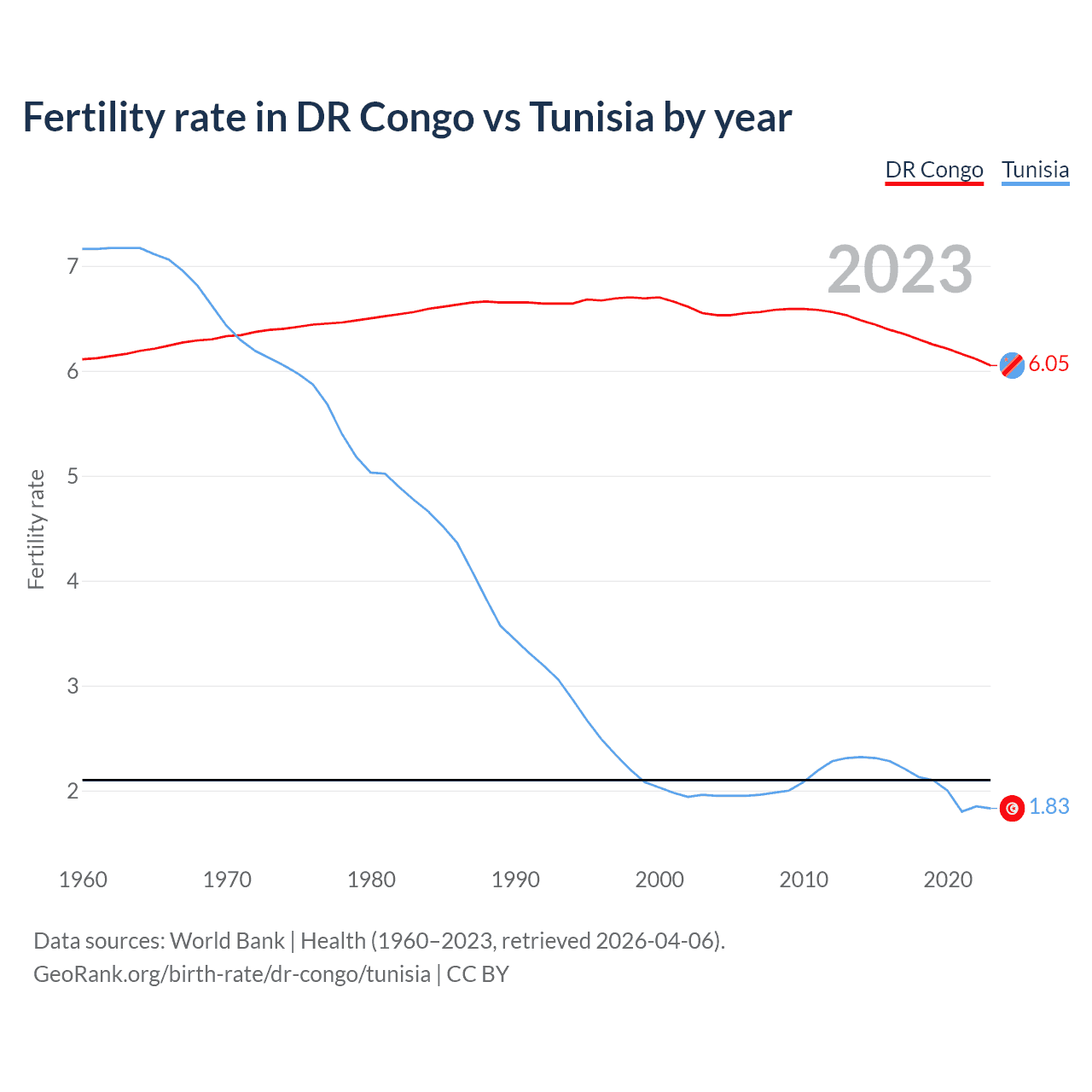 1960 vs 2023, the fertility rate has decreased by 0.88% in the DR Congo and by 74.4% in Tunisia — in 1960, it was 6.11 and 7.16, respectively.