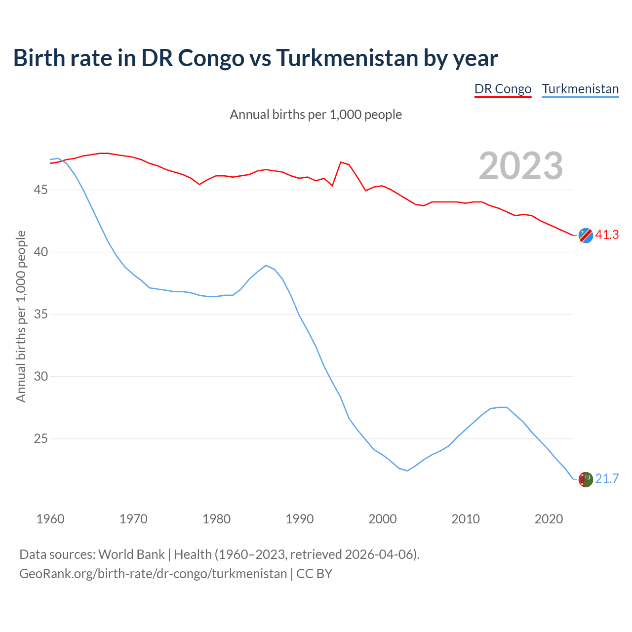 The DR Congo has an annual birth rate of 41.3 births per 1,000 people, compared to 21.7 for Turkmenistan. The average number of children a woman is expected to have during her lifetime — the fertility rate, is 6.05 in the DR Congo and 2.69 in Turkmenistan — 55.5% difference.