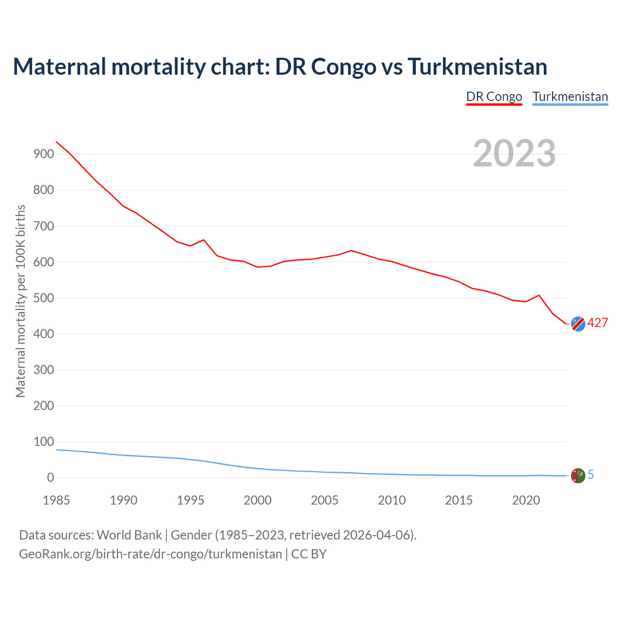 The maternal mortality rate, which is the probability of dying during childbirth or within 42 days of pregnancy termination, is 427 deaths per 100,000 live births in the DR Congo, compared to 5 deaths in Turkmenistan.