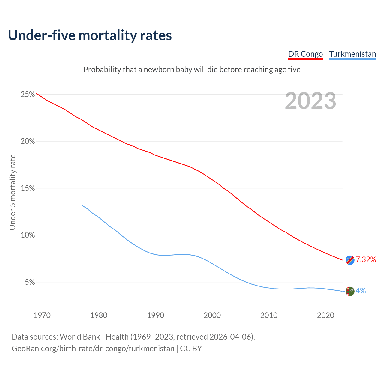 The chance that a newborn baby will die before reaching age five is 7.32% in the DR Congo and 4% in Turkmenistan. Above is a chart with historical data on under-five mortality rates.