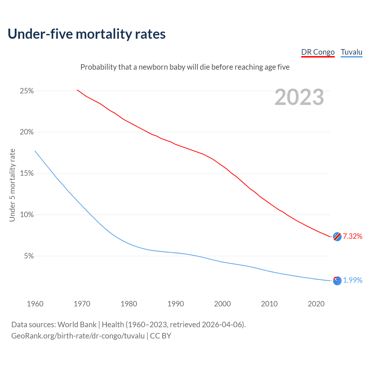 The chance that a newborn baby will die before reaching age five is 7.32% in the DR Congo and 1.99% in Tuvalu. Above is a chart with historical data on under-five mortality rates.