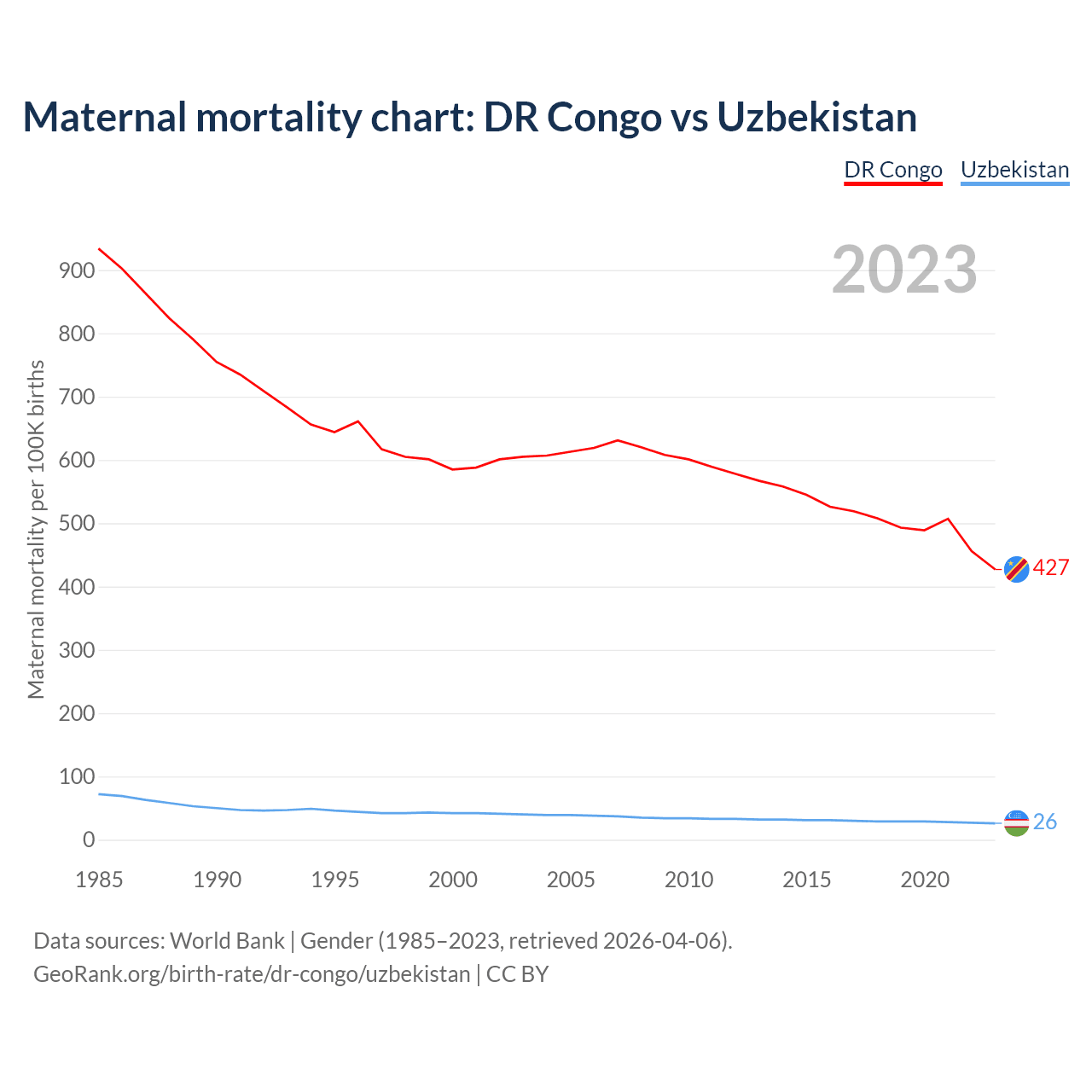 The maternal mortality rate, which is the probability of dying during childbirth or within 42 days of pregnancy termination, is 427 deaths per 100,000 live births in the DR Congo, compared to 26 deaths in Uzbekistan.