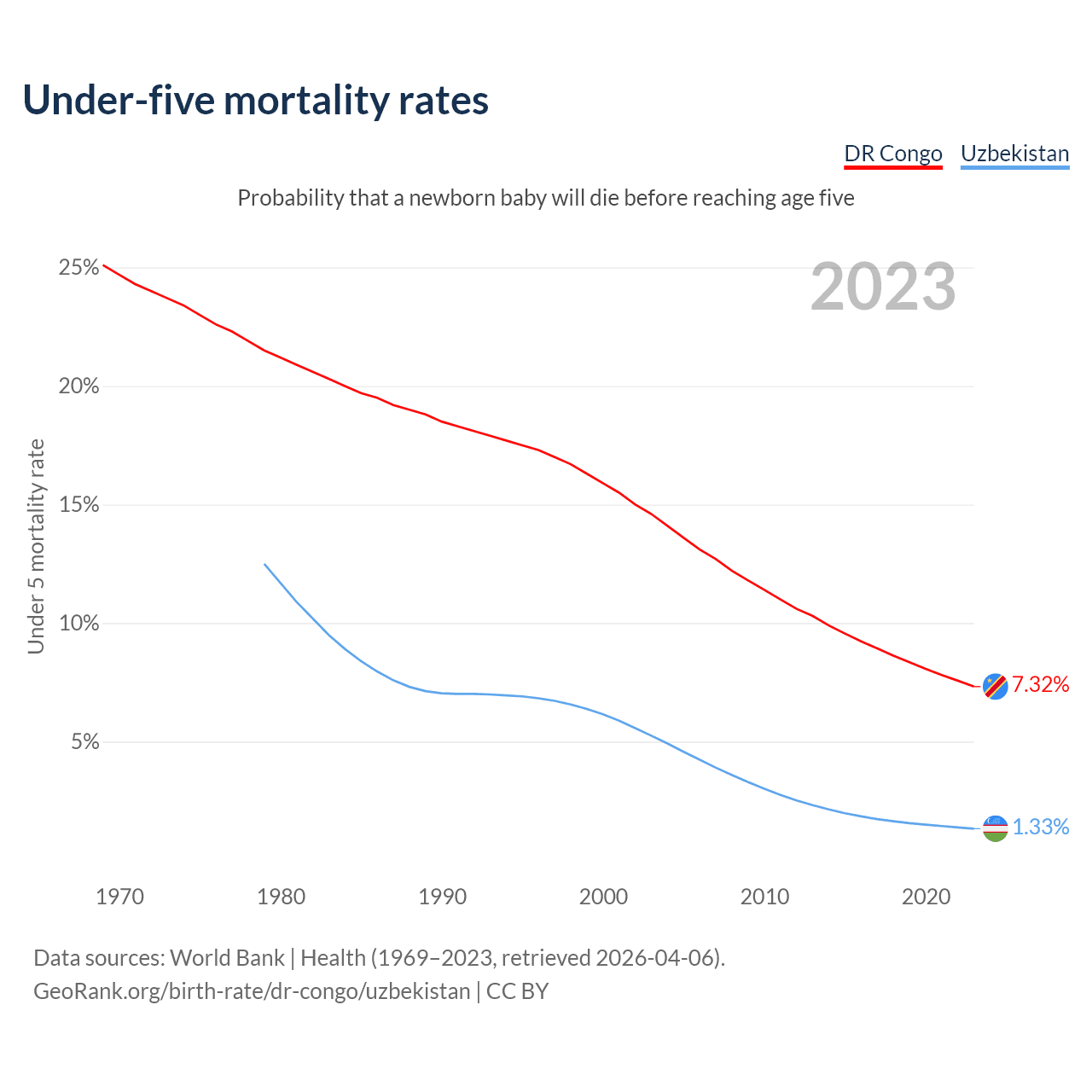 The chance that a newborn baby will die before reaching age five is 7.32% in the DR Congo and 1.33% in Uzbekistan. Above is a chart with historical data on under-five mortality rates.