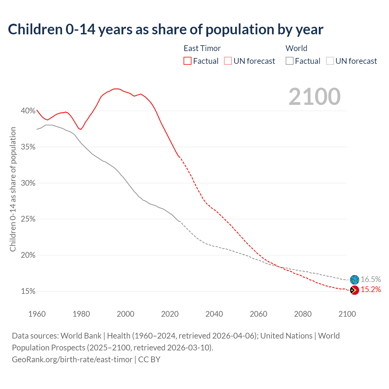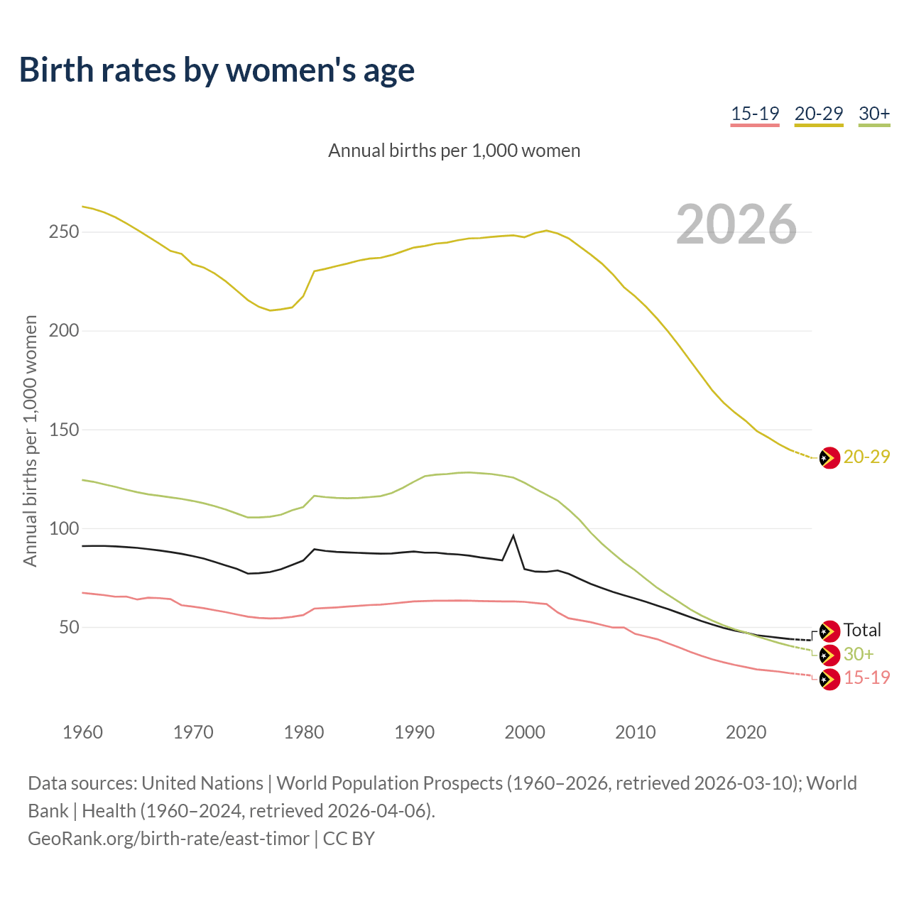 East Timor has a birth rate of 22.1 (annual births per 1,000 people) and a fertility rate of 2.71 (the average number of children a woman is expected to have over her lifetime based on current age-specific birth rates).