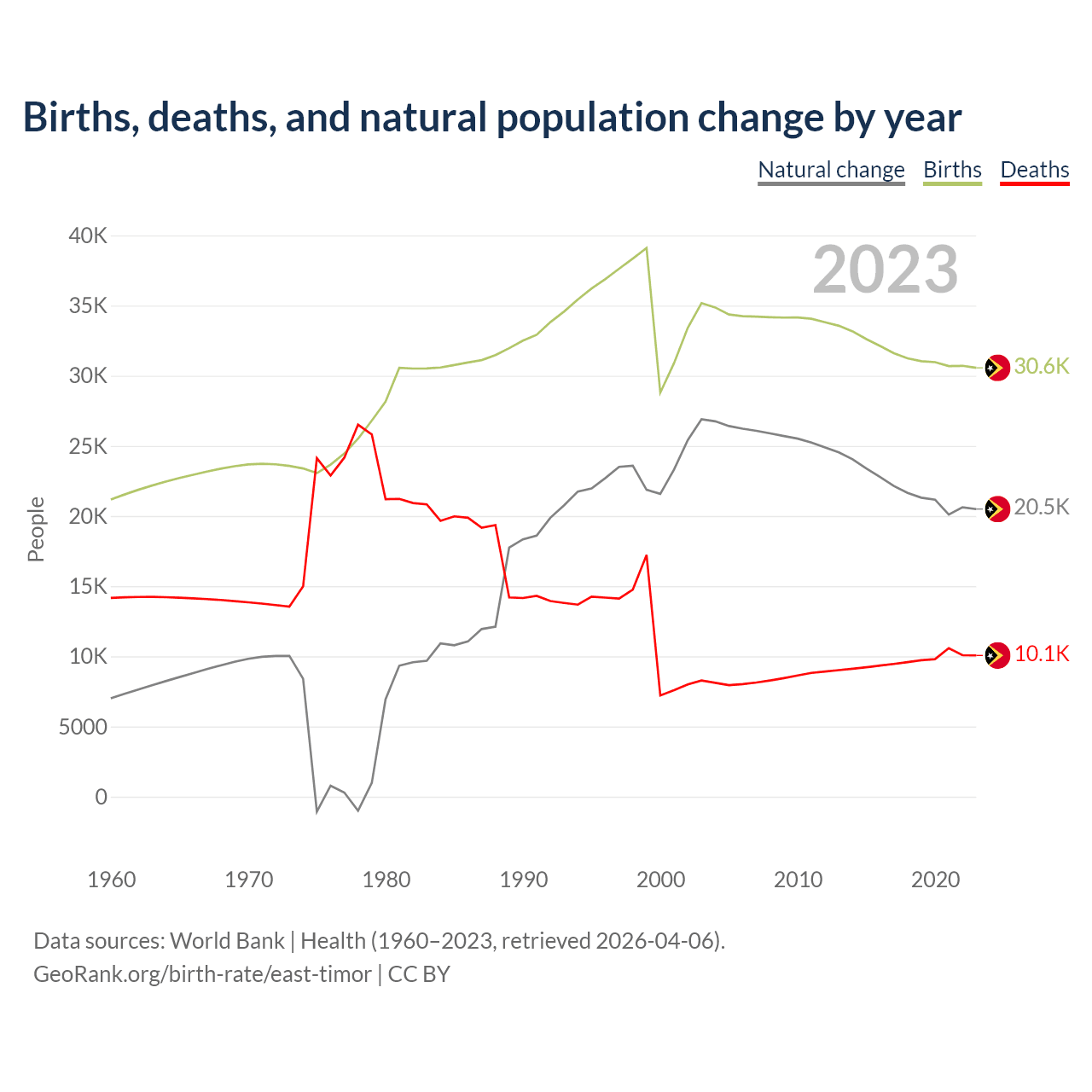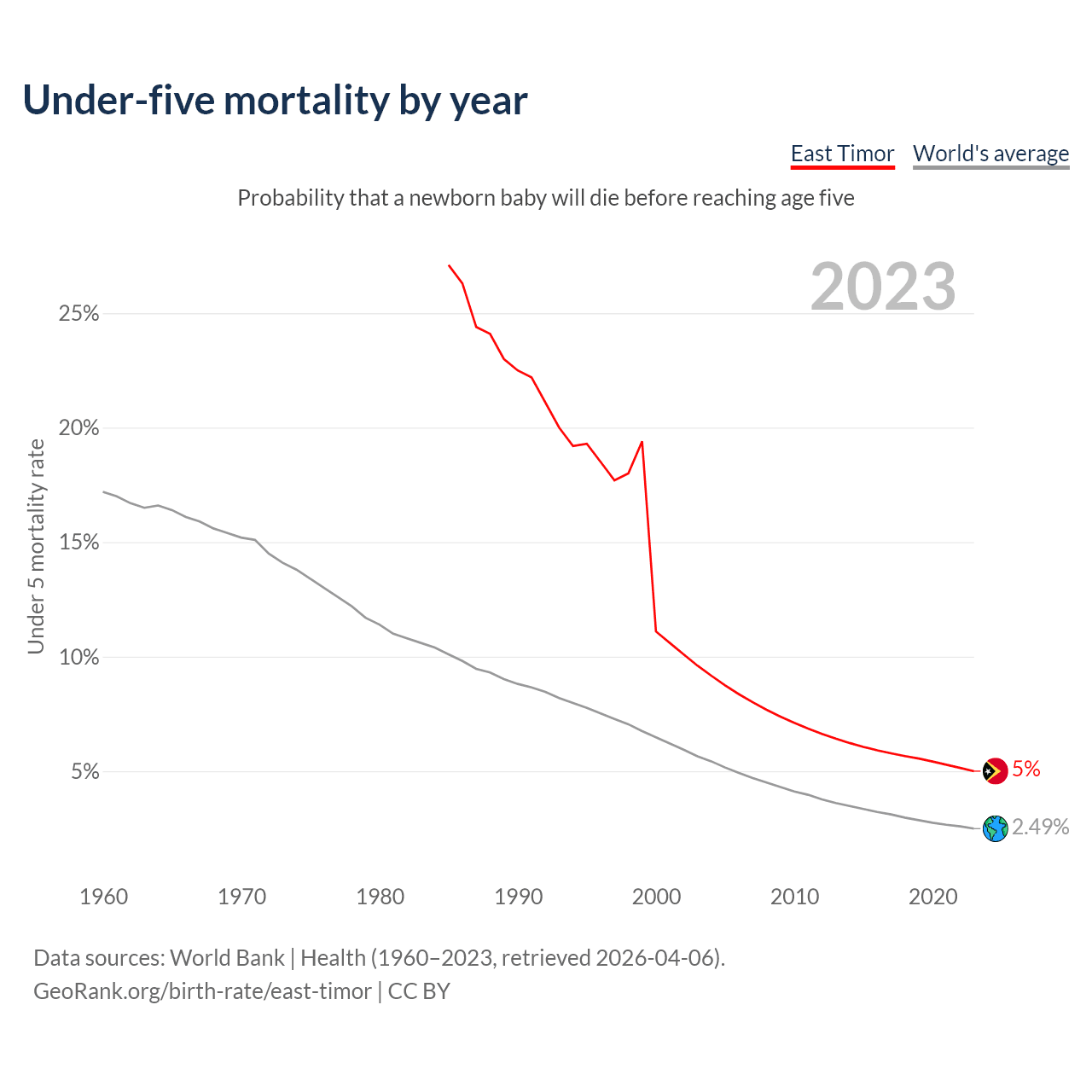 The under-5 mortality rate in East Timor was 50 deaths per 1,000 live births in 2023 — a 5% chance that a newborn baby will die before reaching age five. This is down from 110.5 deaths per 1,000 live births in 2000.